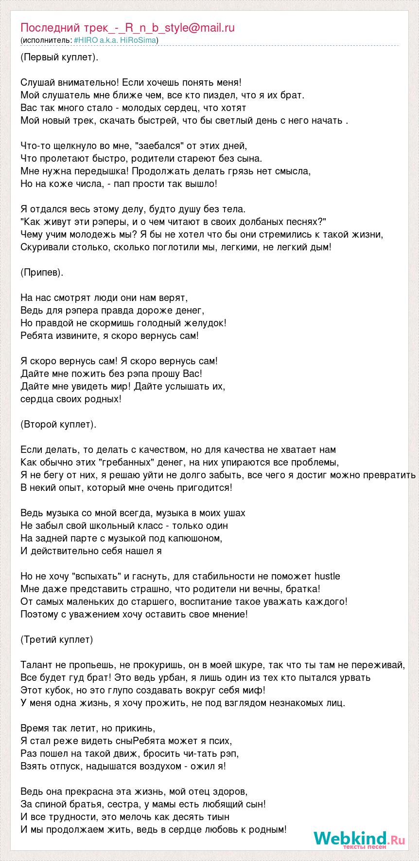 (Первый куплет). Слушай внимательно! Если хочешь понять меня! Мой слушатель мне ближе чем, все кто пиздел, что я их брат. Вас так много стало - молодых сердец, что хотят Мой новый трек, скачать быстрей, что бы светлый день с него начать . Что-то щелкнуло во мне, "заебался" от этих дней, Что пролетают быстро, родители стареют без сына. Мне нужна передышка! Продолжать делать грязь нет смысла, Но на коже числа, - пап прости так вышло! Я отдался весь этому делу, будто душу без тела. "Как живут эти рэперы, и о чем читают в своих долбаных песнях?" Чему учим молодежь мы? Я бы не хотел что бы они стремились к такой жизни, Скуривали столько, сколько поглотили мы, легкими, не легкий дым! (Припев). На нас смотрят люди они нам верят, Ведь для рэпера правда дороже денег, Но правдой не скормишь голодный желудок! Ребята извините, я скоро вернусь сам! Я скоро вернусь сам! Я скоро вернусь сам! Дайте мне пожить без рэпа прошу Вас! Дайте мне увидеть мир! Дайте услышать их, сердца своих родных! (Второй куплет). Если делать, то делать с качеством, но для качества не хватает нам Как обычно этих "гребанных" денег, на них упираются все проблемы, Я не бегу от них, я решаю уйти не долго забыть, все чего я достиг можно превратить В некий опыт, который мне очень пригодится! Ведь музыка со мной всегда, музыка в моих ушах Не забыл свой школьный класс - только один На задней парте с музыкой под капюшоном, И действительно себя нашел я Но не хочу "вспыхать" и гаснуть, для стабильности не поможет hustle Мне даже представить страшно, что родители ни вечны, братка! От самых маленьких до старшего, воспитание такое уважать каждого! Поэтому с уважением хочу оставить свое мнение! (Третий куплет) Талант не пропьешь, не прокуришь, он в моей шкуре, так что ты там не переживай, Все будет гуд брат! Это ведь урбан, я лишь один из тех кто пытался урвать Этот кубок, но это глупо создавать вокруг себя миф! У меня одна жизнь, я хочу прожить, не под взглядом незнакомых лиц. Время так летит, но прикинь, Я стал реже видеть сныРебята может я псих, Раз пошел на такой движ, бросить чи-тать рэп, Взять отпуск, надышатся воздухом - ожил я! Ведь она прекрасна эта жизнь, мой отец здоров, За спиной братья, сестра, у мамы есть любящий сын! И все трудности, это мелочь как десять тиын И мы продолжаем жить, ведь в сердце любовь к родным!