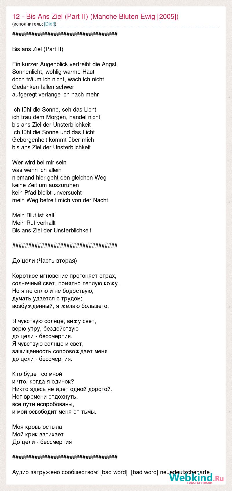 ################################# Bis ans Ziel (Part II) Ein kurzer Augenblick vertreibt die Angst Sonnenlicht, wohlig warme Haut doch träum ich nicht, wach ich nicht Gedanken fallen schwer aufgeregt verlange ich nach mehr Ich fühl die Sonne, seh das Licht ich trau dem Morgen, handel nicht bis ans Ziel der Unsterblichkeit Ich fühl die Sonne und das Licht Geborgenheit kommt über mich bis ans Ziel der Unsterblichkeit Wer wird bei mir sein was wenn ich allein niemand hier geht den gleichen Weg keine Zeit um auszuruhen kein Pfad bleibt unversucht mein Weg befreit mich von der Nacht Mein Blut ist kalt Mein Ruf verhallt Bis ans Ziel der Unsterblichkeit ################################# До цели (Часть вторая) Короткое мгновение прогоняет страх, солнечный свет, приятно теплую кожу. Но я не сплю и не бодрствую, думать удается с трудом; возбужденный, я желаю большего. Я чувствую солнце, вижу свет, верю утру, бездействую до цели - бессмертия. Я чувствую солнце и свет, защищенность сопровождает меня до цели - бессмертия. Кто будет со мной и что, когда я одинок? Никто здесь не идет одной дорогой. Нет времени отдохнуть, все пути испробованы, и мой освободит меня от тьмы. Моя кровь остыла Мой крик затихает До цели - бессмертия ################################# Аудио загружено сообществом: [bad word] [bad word] neuedeutscheharte