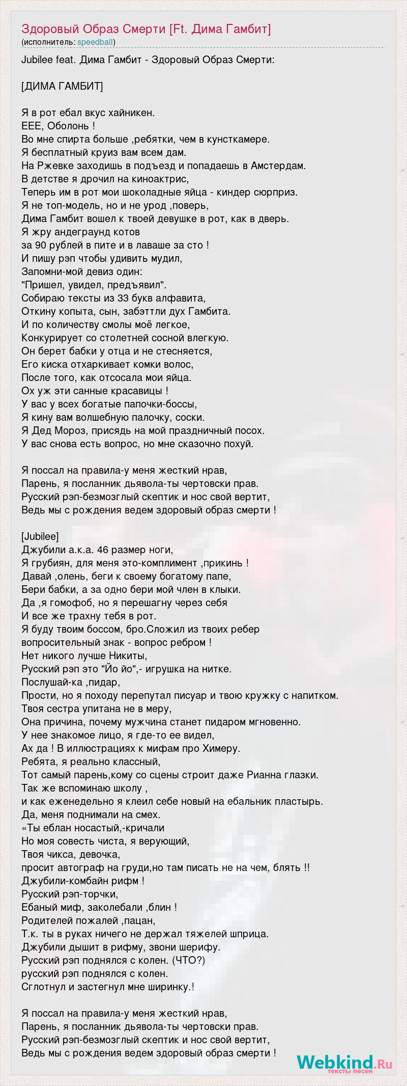 Jubilee feat. Дима Гамбит - Здоровый Образ Смерти: [ДИМА ГАМБИТ] Я в рот ебал вкус хайникен. ЕЕЕ, Оболонь ! Во мне спирта больше ,ребятки, чем в кунсткамере. Я бесплатный круиз вам всем дам. На Ржевке заходишь в подъезд и попадаешь в Амстердам. В детстве я дрочил на киноактрис, Теперь им в рот мои шоколадные яйца - киндер сюрприз. Я не топ-модель, но и не урод ,поверь, Дима Гамбит вошел к твоей девушке в рот, как в дверь. Я жру андеграунд котов за 90 рублей в пите и в лаваше за сто ! И пишу рэп чтобы удивить мудил, Запомни-мой девиз один: "Пришел, увидел, предъявил". Собираю тексты из 33 букв алфавита, Откину копыта, сын, забэттли дух Гамбита. И по количеству смолы моё легкое, Конкурирует со столетней сосной влегкую. Он берет бабки у отца и не стесняется, Его киска отхаркивает комки волос, После того, как отсосала мои яйца. Ох уж эти санные красавицы ! У вас у всех богатые папочки-боссы, Я кину вам волшебную палочку, соски. Я Дед Мороз, присядь на мой праздничный посох. У вас снова есть вопрос, но мне сказочно похуй. Я поссал на правила-у меня жесткий нрав, Парень, я посланник дьявола-ты чертовски прав. Русский рэп-безмозглый скептик и нос свой вертит, Ведь мы с рождения ведем здоровый образ смерти ! [Jubilee] Джубили а.к.а. 46 размер ноги, Я грубиян, для меня это-комплимент ,прикинь ! Давай ,олень, беги к своему богатому папе, Бери бабки, а за одно бери мой член в клыки. Да ,я гомофоб, но я перешагну через себя И все же трахну тебя в рот. Я буду твоим боссом, бро.Сложил из твоих ребер вопросительный знак - вопрос ребром ! Нет никого лучше Никиты, Русский рэп это "Йо йо",- игрушка на нитке. Послушай-ка ,пидар, Прости, но я походу перепутал писуар и твою кружку с напитком. Твоя сестра упитана не в меру, Она причина, почему мужчина станет пидаром мгновенно. У нее знакомое лицо, я где-то ее видел, Ах да ! В иллюстрациях к мифам про Химеру. Ребята, я реально классный, Тот самый парень,кому со сцены строит даже Рианна глазки. Так же вспоминаю школу , и как еженедельно я клеил себе новый на ебальник пластырь. Да, меня поднимали на смех. «Ты еблан носастый,-кричали Но моя совесть чиста, я верующий, Твоя чикса, девочка, просит автограф на груди,но там писать не на чем, блять !! Джубили-комбайн рифм ! Русский рэп-торчки, Ебаный миф, заколебали ,блин ! Родителей пожалей ,пацан, Т.к. ты в руках ничего не держал тяжелей шприца. Джубили дышит в рифму, звони шерифу. Русский рэп поднялся с колен. (ЧТО?) русский рэп поднялся с колен. Сглотнул и застегнул мне ширинку.! Я поссал на правила-у меня жесткий нрав, Парень, я посланник дьявола-ты чертовски прав. Русский рэп-безмозглый скептик и нос свой вертит, Ведь мы с рождения ведем здоровый образ смерти !