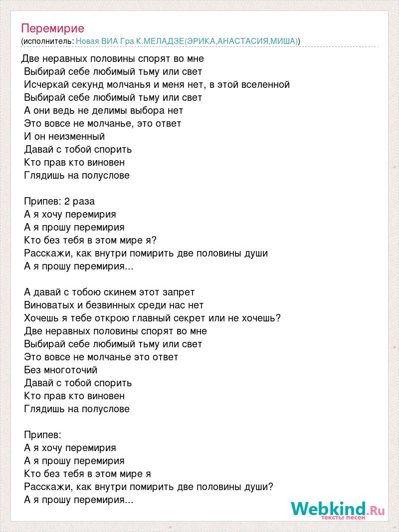 Две неравных половины спорят во мне Выбирай себе любимый тьму или свет Исчеркай секунд молчанья и меня нет, в этой вселенной Выбирай себе любимый тьму или свет А они ведь не делимы выбора нет Это вовсе не молчанье, это ответ И он неизменный Давай с тобой спорить Кто прав кто виновен Глядишь на полуслове Припев: 2 раза А я хочу перемирия А я прошу перемирия Кто без тебя в этом мире я? Расскажи, как внутри помирить две половины души А я прошу перемирия... А давай с тобою скинем этот запрет Виноватых и безвинных среди нас нет Хочешь я тебе открою главный секрет или не хочешь? Две неравных половины спорят во мне Выбирай себе любимый тьму или свет Это вовсе не молчанье это ответ Без многоточий Давай с тобой спорить Кто прав кто виновен Глядишь на полуслове Припев: А я хочу перемирия А я прошу перемирия Кто без тебя в этом мире я Расскажи, как внутри помирить две половины души? А я прошу перемирия...