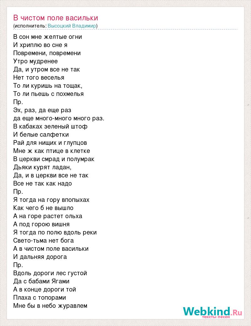 В сон мне желтые огни И хриплю во сне я Повремени, повремени Утро мудренее Да, и утром все не так Нет того веселья То ли куришь на тощак, То ли пьешь с похмелья Пр. Эх, раз, да еще раз да еще много-много много раз. В кабаках зеленый штоф И белые салфетки Рай для нищих и глупцов Мне ж как птице в клетке В церкви смрад и полумрак Дьяки курят ладан, Да, и в церкви все не так Все не так как надо Пр. Я тогда на гору впопыхах Как чего б не вышло А на горе растет ольха А под горою вишня Я тогда по полю вдоль реки Свето-тьма нет бога А в чистом поле васильки И дальняя дорога Пр. Вдоль дороги лес густой Да с бабами Ягами А в конце дороги той Плаха с топорами Мне бы в небо журавлем