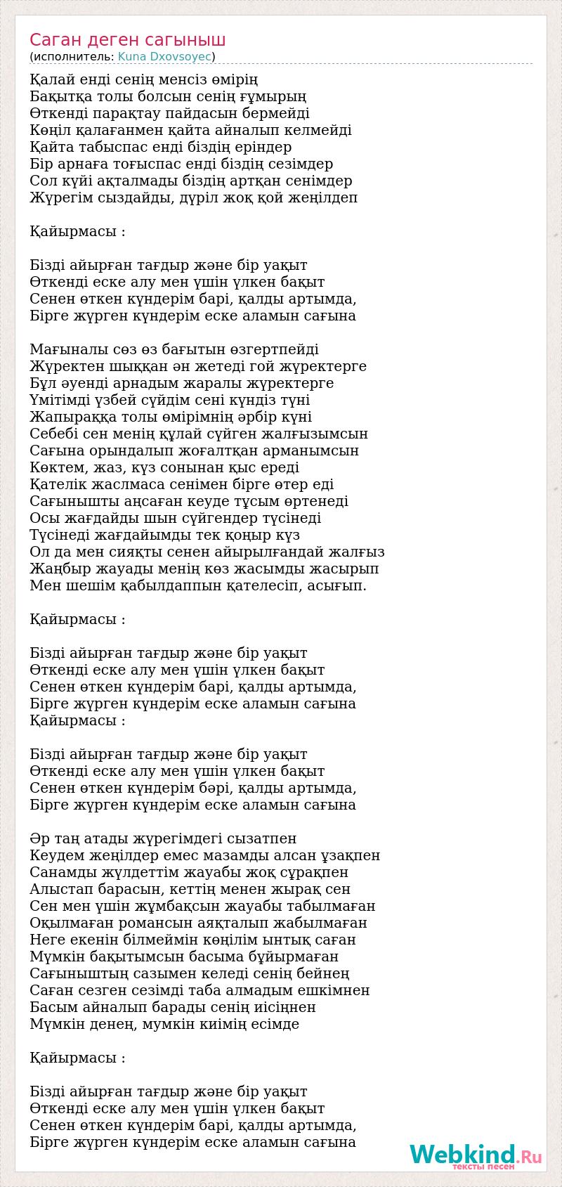 Қалай енді сенің менсіз өмірің Бақытқа толы болсын сенің ғұмырың Өткенді парақтау пайдасын бермейді Көңіл қалағанмен қайта айналып келмейді Қайта табыспас енді біздің еріндер Бір арнаға тоғыспас енді біздің сезімдер Сол күйі ақталмады біздің артқан сенімдер Жүрегім сыздайды, дүріл жоқ қой жеңілдеп Қайырмасы : Бізді айырған тағдыр және бір уақыт Өткенді еске алу мен үшін үлкен бақыт Сенен өткен күндерім барі, қалды артымда, Бірге жүрген күндерім еске аламын сағына Мағыналы сөз өз бағытын өзгертпейді Жүректен шыққан ән жетеді гой жүректерге Бұл әуенді арнадым жаралы жүректерге Үмітімді үзбей сүйдім сені күндіз түні Жапыраққа толы өмірімнің әрбір күні Себебі сен менің құлай сүйген жалғызымсын Сағына орындалып жоғалтқан арманымсын Көктем, жаз, күз сонынан қыс ереді Қателік жаслмаса сенімен бірге өтер еді Сағынышты аңсаған кеуде тұсым өртенеді Осы жағдайды шын сүйгендер түсінеді Түсінеді жағдайымды тек қоңыр күз Ол да мен сияқты сенен айырылғандай жалғыз Жаңбыр жауады менің көз жасымды жасырып Мен шешім қабылдаппын қателесіп, асығып. Қайырмасы : Бізді айырған тағдыр және бір уақыт Өткенді еске алу мен үшін үлкен бақыт Сенен өткен күндерім барі, қалды артымда, Бірге жүрген күндерім еске аламын сағына Қайырмасы : Бізді айырған тағдыр және бір уақыт Өткенді еске алу мен үшін үлкен бақыт Сенен өткен күндерім бәрі, қалды артымда, Бірге жүрген күндерім еске аламын сағына Әр таң атады жүрегімдегі сызатпен Кеудем жеңілдер емес мазамды алсан ұзақпен Санамды жүлдеттім жауабы жоқ сұрақпен Алыстап барасын, кеттің менен жырақ сен Сен мен үшін жұмбақсын жауабы табылмаған Оқылмаған романсын аяқталып жабылмаған Неге екенін білмеймін көңілім ынтық саған Мүмкін бақытымсын басыма бұйырмаған Сағыныштың сазымен келеді сенің бейнең Саған сезген сезімді таба алмадым ешкімнен Басым айналып барады сенің иісіңнен Мүмкін денең, мумкін киімің есімде Қайырмасы : Бізді айырған тағдыр және бір уақыт Өткенді еске алу мен үшін үлкен бақыт Сенен өткен күндерім барі, қалды артымда, Бірге жүрген күндерім еске аламын сағына