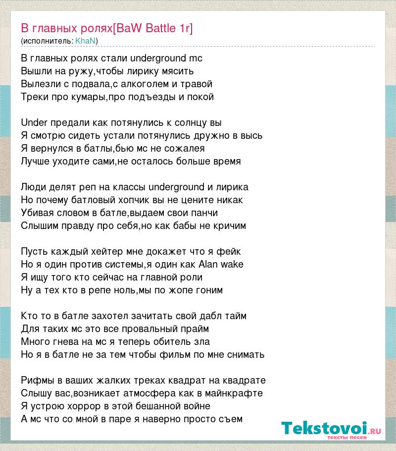 В главных ролях стали underground mc Вышли на ружу,чтобы лирику мясить Вылезли с подвала,с алкоголем и травой Треки про кумары,про подъезды и покой Under предали как потянулись к солнцу вы Я смотрю сидеть устали потянулись дружно в высь Я вернулся в батлы,бью мс не сожалея Лучше уходите сами,не осталось больше время Люди делят реп на классы underground и лирика Но почему батловый хопчик вы не цените никак Убивая словом в батле,выдаем свои панчи Слышим правду про себя,но как бабы не кричим Пусть каждый хейтер мне докажет что я фейк Но я один против системы,я один как Alan wake Я ищу того кто сейчас на главной роли Ну а тех кто в репе ноль,мы по жопе гоним Кто то в батле захотел зачитать свой дабл тайм Для таких мс это все провальный прайм Много гнева на мс я теперь обитель зла Но я в батле не за тем чтобы фильм по мне снимать Рифмы в ваших жалких треках квадрат на квадрате Слышу вас,возникает атмосфера как в майнкрафте Я устрою хоррор в этой бешанной войне А мс что со мной в паре я наверно просто съем