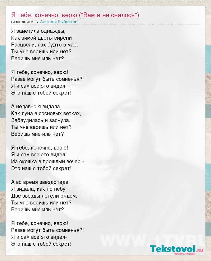 Я заметила однажды, Как зимой цветы сирени Расцвели, как будто в мае. Ты мне веришь или нет? Веришь мне иль нет? Я тебе, конечно, верю! Разве могут быть сомненья?! Я и сам все это видел - Это наш с тобой секрет! А недавно я видала, Как луна в сосновых ветках, Заблудилась и заснула. Ты мне веришь или нет? Веришь мне иль нет? Я тебе, конечно, верю! Я и сам все это видел! Из окошка в прошлый вечер - Это наш с тобой секрет! А во время звездопада Я видала, как по небу Две звезды летели рядом. Ты мне веришь или нет? Веришь мне иль нет? Я тебе, конечно, верю! Разве могут быть сомненья?! Я и сам все это видел- Это наш с тобой секрет!