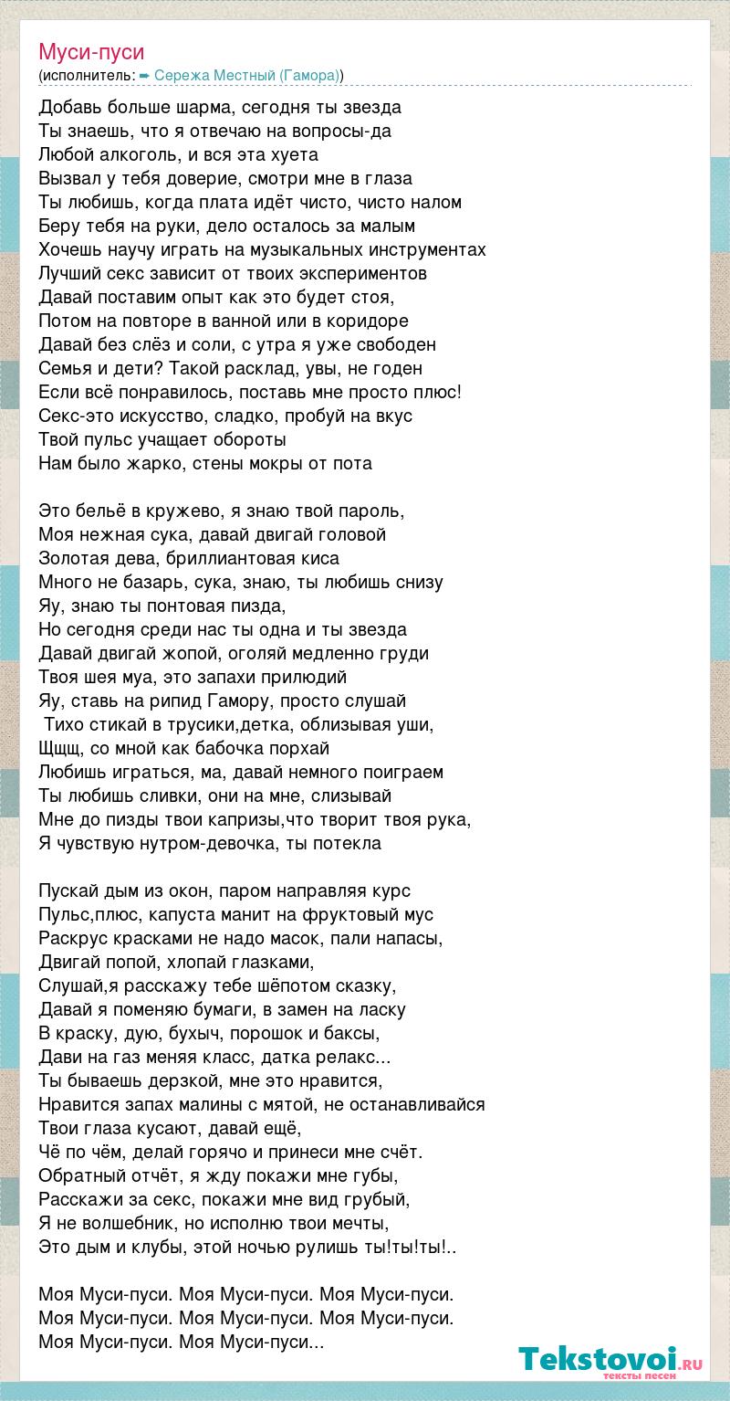 Добавь больше шарма, сегодня ты звезда Ты знаешь, что я отвечаю на вопросы-да Любой алкоголь, и вся эта хуета Вызвал у тебя доверие, смотри мне в глаза Ты любишь, когда плата идёт чисто, чисто налом Беру тебя на руки, дело осталось за малым Хочешь научу играть на музыкальных инструментах Лучший секс зависит от твоих экспериментов Давай поставим опыт как это будет стоя, Потом на повторе в ванной или в коридоре Давай без слёз и соли, с утра я уже свободен Семья и дети? Такой расклад, увы, не годен Если всё понравилось, поставь мне просто плюс! Секс-это искусство, сладко, пробуй на вкус Твой пульс учащает обороты Нам было жарко, стены мокры от пота Это бельё в кружево, я знаю твой пароль, Моя нежная сука, давай двигай головой Золотая дева, бриллиантовая киса Много не базарь, сука, знаю, ты любишь снизу Яу, знаю ты понтовая пизда, Но сегодня среди нас ты одна и ты звезда Давай двигай жопой, оголяй медленно груди Твоя шея муа, это запахи прилюдий Яу, ставь на рипид Гамору, просто слушай Тихо стикай в трусики,детка, облизывая уши, Щщщ, со мной как бабочка порхай Любишь играться, ма, давай немного поиграем Ты любишь сливки, они на мне, слизывай Мне до пизды твои капризы,что творит твоя рука, Я чувствую нутром-девочка, ты потекла Пускай дым из окон, паром направляя курс Пульс,плюс, капуста манит на фруктовый мус Раскрус красками не надо масок, пали напасы, Двигай попой, хлопай глазками, Слушай,я расскажу тебе шёпотом сказку, Давай я поменяю бумаги, в замен на ласку В краску, дую, бухыч, порошок и баксы, Дави на газ меняя класс, датка релакс... Ты бываешь дерзкой, мне это нравится, Нравится запах малины с мятой, не останавливайся Твои глаза кусают, давай ещё, Чё по чём, делай горячо и принеси мне счёт. Обратный отчёт, я жду покажи мне губы, Расскажи за секс, покажи мне вид грубый, Я не волшебник, но исполню твои мечты, Это дым и клубы, этой ночью рулишь ты!ты!ты!.. Моя Муси-пуси. Моя Муси-пуси. Моя Муси-пуси. Моя Муси-пуси. Моя Муси-пуси. Моя Муси-пуси. Моя Муси-пуси. Моя Муси-пуси...