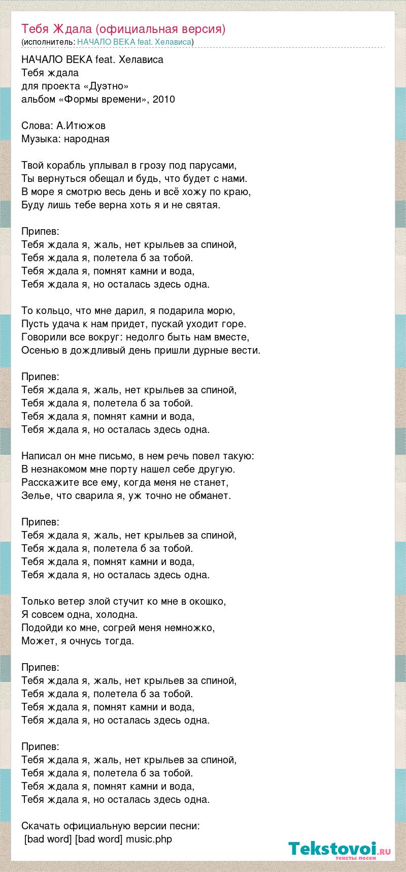 НАЧАЛО ВЕКА feat. Хелависа Тебя ждала для проекта «Дуэтно» альбом «Формы времени», 2010 Слова: А.Итюжов Музыка: народная Твой корабль уплывал в грозу под парусами, Ты вернуться обещал и будь, что будет с нами. В море я смотрю весь день и всё хожу по краю, Буду лишь тебе верна хоть я и не святая. Припев: Тебя ждала я, жаль, нет крыльев за спиной, Тебя ждала я, полетела б за тобой. Тебя ждала я, помнят камни и вода, Тебя ждала я, но осталась здесь одна. То кольцо, что мне дарил, я подарила морю, Пусть удача к нам придет, пускай уходит горе. Говорили все вокруг: недолго быть нам вместе, Осенью в дождливый день пришли дурные вести. Припев: Тебя ждала я, жаль, нет крыльев за спиной, Тебя ждала я, полетела б за тобой. Тебя ждала я, помнят камни и вода, Тебя ждала я, но осталась здесь одна. Написал он мне письмо, в нем речь повел такую: В незнакомом мне порту нашел себе другую. Расскажите все ему, когда меня не станет, Зелье, что сварила я, уж точно не обманет. Припев: Тебя ждала я, жаль, нет крыльев за спиной, Тебя ждала я, полетела б за тобой. Тебя ждала я, помнят камни и вода, Тебя ждала я, но осталась здесь одна. Только ветер злой стучит ко мне в окошко, Я совсем одна, холодна. Подойди ко мне, согрей меня немножко, Может, я очнусь тогда. Припев: Тебя ждала я, жаль, нет крыльев за спиной, Тебя ждала я, полетела б за тобой. Тебя ждала я, помнят камни и вода, Тебя ждала я, но осталась здесь одна. Припев: Тебя ждала я, жаль, нет крыльев за спиной, Тебя ждала я, полетела б за тобой. Тебя ждала я, помнят камни и вода, Тебя ждала я, но осталась здесь одна. Скачать официальную версии песни: [bad word] [bad word] music.php