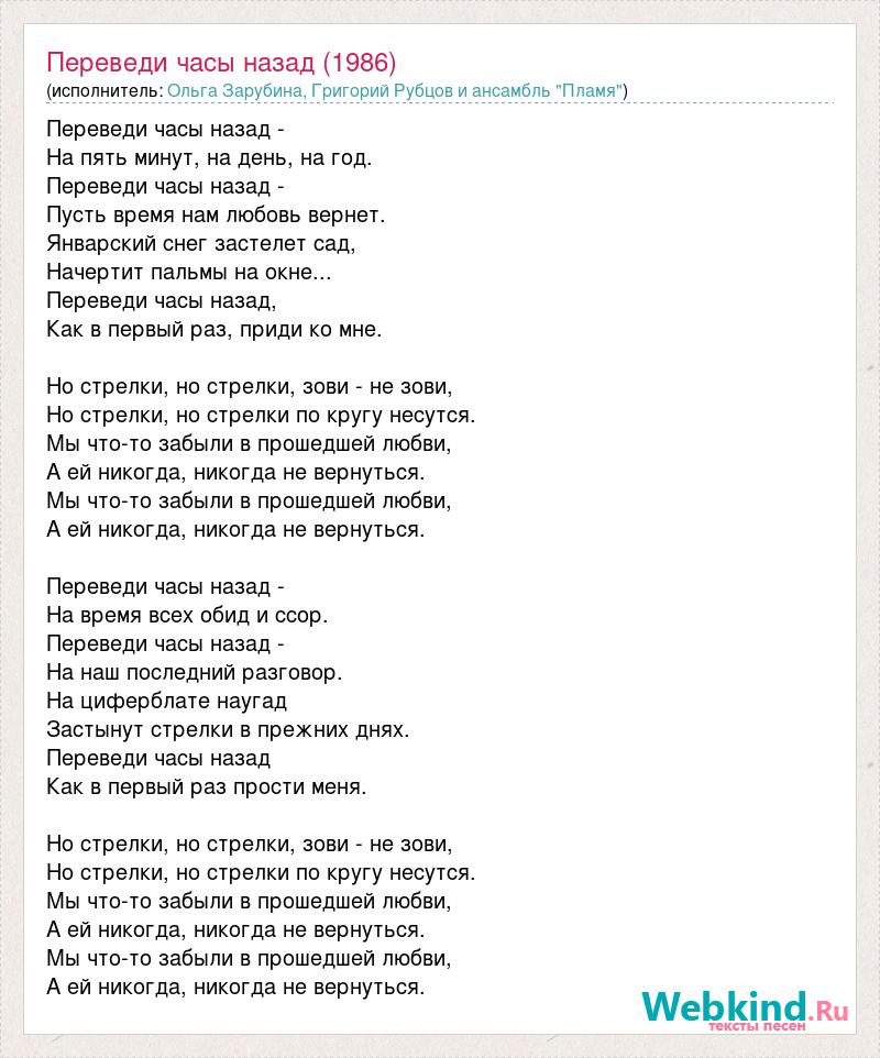 Переведи часы назад - На пять минут, на день, на год. Переведи часы назад - Пусть время нам любовь вернет. Январский снег застелет сад, Начертит пальмы на окне... Переведи часы назад, Как в первый раз, приди ко мне. Но стрелки, но стрелки, зови - не зови, Но стрелки, но стрелки по кругу несутся. Мы что-то забыли в прошедшей любви, А ей никогда, никогда не вернуться. Мы что-то забыли в прошедшей любви, А ей никогда, никогда не вернуться. Переведи часы назад - На время всех обид и ссор. Переведи часы назад - На наш последний разговор. На циферблате наугад Застынут стрелки в прежних днях. Переведи часы назад Как в первый раз прости меня. Но стрелки, но стрелки, зови - не зови, Но стрелки, но стрелки по кругу несутся. Мы что-то забыли в прошедшей любви, А ей никогда, никогда не вернуться. Мы что-то забыли в прошедшей любви, А ей никогда, никогда не вернуться.