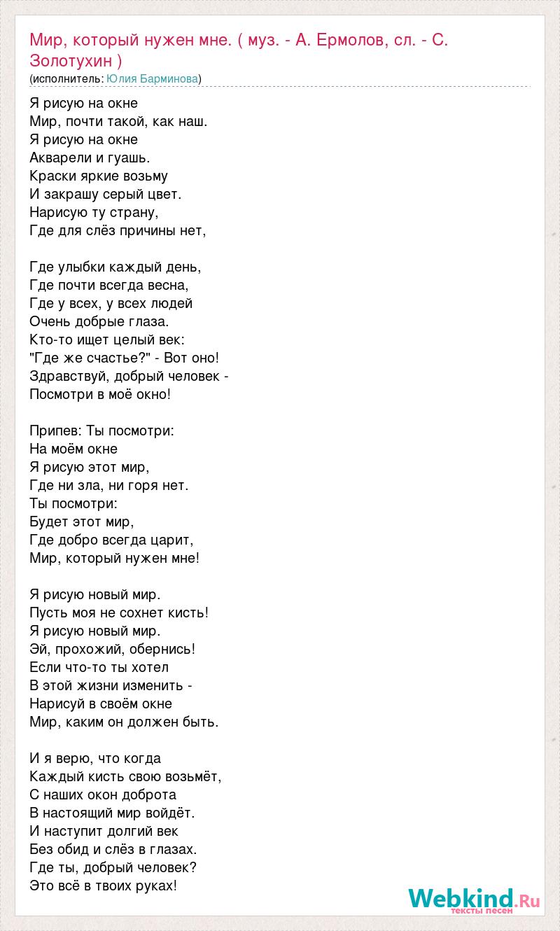 Я рисую на окне Мир, почти такой, как наш. Я рисую на окне Акварели и гуашь. Краски яркие возьму И закрашу серый цвет. Нарисую ту страну, Где для слёз причины нет, Где улыбки каждый день, Где почти всегда весна, Где у всех, у всех людей Очень добрые глаза. Кто-то ищет целый век: "Где же счастье?" - Вот оно! Здравствуй, добрый человек - Посмотри в моё окно! Припев: Ты посмотри: На моём окне Я рисую этот мир, Где ни зла, ни горя нет. Ты посмотри: Будет этот мир, Где добро всегда царит, Мир, который нужен мне! Я рисую новый мир. Пусть моя не сохнет кисть! Я рисую новый мир. Эй, прохожий, обернись! Если что-то ты хотел В этой жизни изменить - Нарисуй в своём окне Мир, каким он должен быть. И я верю, что когда Каждый кисть свою возьмёт, С наших окон доброта В настоящий мир войдёт. И наступит долгий век Без обид и слёз в глазах. Где ты, добрый человек? Это всё в твоих руках!
