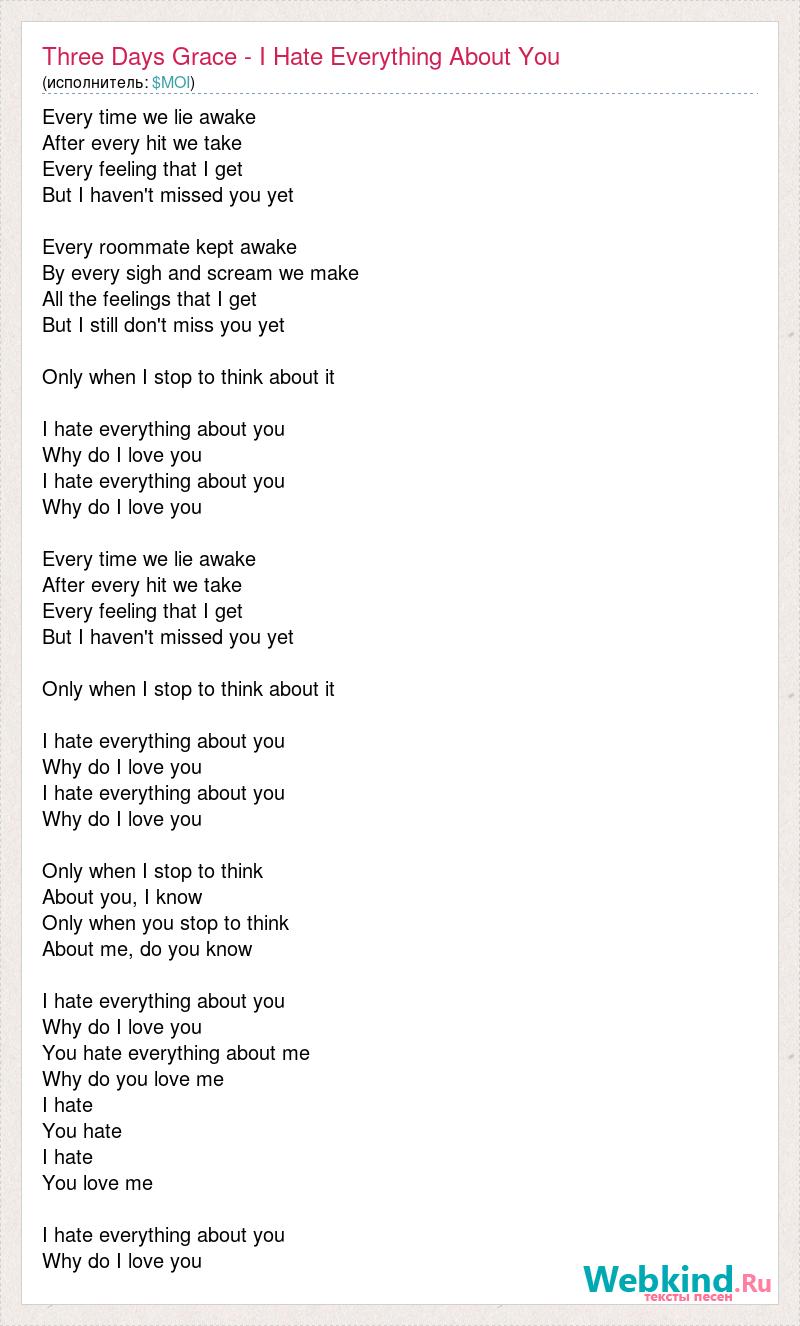 Every time we lie awake After every hit we take Every feeling that I get But I haven't missed you yet Every roommate kept awake By every sigh and scream we make All the feelings that I get But I still don't miss you yet Only when I stop to think about it I hate everything about you Why do I love you I hate everything about you Why do I love you Every time we lie awake After every hit we take Every feeling that I get But I haven't missed you yet Only when I stop to think about it I hate everything about you Why do I love you I hate everything about you Why do I love you Only when I stop to think About you, I know Only when you stop to think About me, do you know I hate everything about you Why do I love you You hate everything about me Why do you love me I hate You hate I hate You love me I hate everything about you Why do I love you