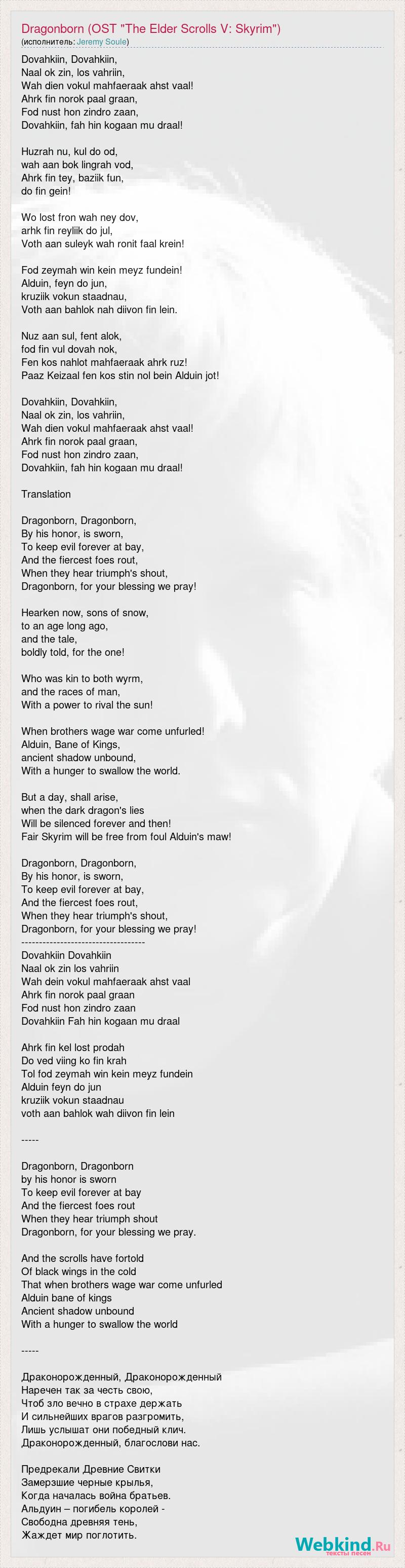 Dovahkiin, Dovahkiin, Naal ok zin, los vahriin, Wah dien vokul mahfaeraak ahst vaal! Ahrk fin norok paal graan, Fod nust hon zindro zaan, Dovahkiin, fah hin kogaan mu draal! Huzrah nu, kul do od, wah aan bok lingrah vod, Ahrk fin tey, baziik fun, do fin gein! Wo lost fron wah ney dov, arhk fin reyliik do jul, Voth aan suleyk wah ronit faal krein! Fod zeymah win kein meyz fundein! Alduin, feyn do jun, kruziik vokun staadnau, Voth aan bahlok nah diivon fin lein. Nuz aan sul, fent alok, fod fin vul dovah nok, Fen kos nahlot mahfaeraak ahrk ruz! Paaz Keizaal fen kos stin nol bein Alduin jot! Dovahkiin, Dovahkiin, Naal ok zin, los vahriin, Wah dien vokul mahfaeraak ahst vaal! Ahrk fin norok paal graan, Fod nust hon zindro zaan, Dovahkiin, fah hin kogaan mu draal! Translation Dragonborn, Dragonborn, By his honor, is sworn, To keep evil forever at bay, And the fiercest foes rout, When they hear triumph's shout, Dragonborn, for your blessing we pray! Hearken now, sons of snow, to an age long ago, and the tale, boldly told, for the one! Who was kin to both wyrm, and the races of man, With a power to rival the sun! When brothers wage war come unfurled! Alduin, Bane of Kings, ancient shadow unbound, With a hunger to swallow the world. But a day, shall arise, when the dark dragon's lies Will be silenced forever and then! Fair Skyrim will be free from foul Alduin's maw! Dragonborn, Dragonborn, By his honor, is sworn, To keep evil forever at bay, And the fiercest foes rout, When they hear triumph's shout, Dragonborn, for your blessing we pray! ----------------------------------- Dovahkiin Dovahkiin Naal ok zin los vahriin Wah dein vokul mahfaeraak ahst vaal Ahrk fin norok paal graan Fod nust hon zindro zaan Dovahkiin Fah hin kogaan mu draal Ahrk fin kel lost prodah Do ved viing ko fin krah Tol fod zeymah win kein meyz fundein Alduin feyn do jun kruziik vokun staadnau voth aan bahlok wah diivon fin lein ----- Dragonborn, Dragonborn by his honor is sworn To keep evil forever at bay And the fiercest foes rout When they hear triumph shout Dragonborn, for your blessing we pray. And the scrolls have fortold Of black wings in the cold That when brothers wage war come unfurled Alduin bane of kings Ancient shadow unbound With a hunger to swallow the world ----- Драконорожденный, Драконорожденный Наречен так за честь свою, Чтоб зло вечно в страхе держать И сильнейших врагов разгромить, Лишь услышат они победный клич. Драконорожденный, благослови нас. Предрекали Древние Свитки Замерзшие черные крылья, Когда началась война братьев. Альдуин – погибель королей - Свободна древняя тень, Жаждет мир поглотить.