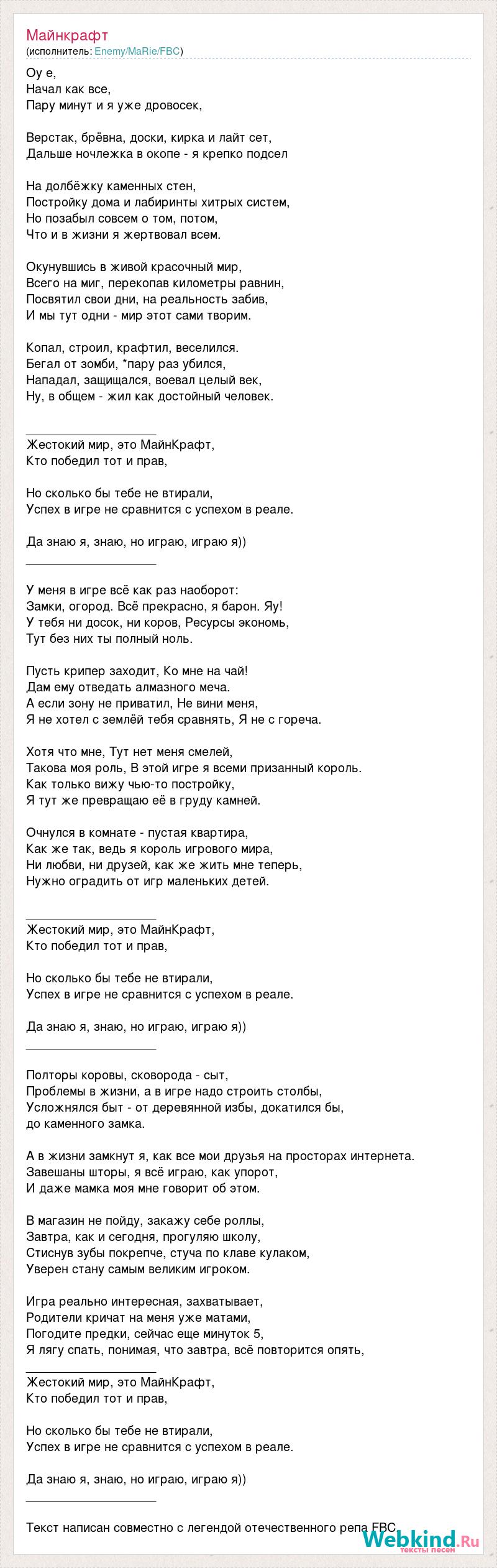 Оу е, Начал как все, Пару минут и я уже дровосек, Верстак, брёвна, доски, кирка и лайт сет, Дальше ночлежка в окопе - я крепко подсел На долбёжку каменных стен, Постройку дома и лабиринты хитрых систем, Но позабыл совсем о том, потом, Что и в жизни я жертвовал всем. Окунувшись в живой красочный мир, Всего на миг, перекопав километры равнин, Посвятил свои дни, на реальность забив, И мы тут одни - мир этот сами творим. Копал, строил, крафтил, веселился. Бегал от зомби, *пару раз убился, Нападал, защищался, воевал целый век, Ну, в общем - жил как достойный человек. ___________________ Жестокий мир, это МайнКрафт, Кто победил тот и прав, Но сколько бы тебе не втирали, Успех в игре не сравнится с успехом в реале. Да знаю я, знаю, но играю, играю я)) ___________________ У меня в игре всё как раз наоборот: Замки, огород. Всё прекрасно, я барон. Яу! У тебя ни досок, ни коров, Ресурсы экономь, Тут без них ты полный ноль. Пусть крипер заходит, Ко мне на чай! Дам ему отведать алмазного меча. А если зону не приватил, Не вини меня, Я не хотел с землёй тебя сравнять, Я не с гореча. Хотя что мне, Тут нет меня смелей, Такова моя роль, В этой игре я всеми призанный король. Как только вижу чью-то постройку, Я тут же превращаю её в груду камней. Очнулся в комнате - пустая квартира, Как же так, ведь я король игрового мира, Ни любви, ни друзей, как же жить мне теперь, Нужно оградить от игр маленьких детей. ___________________ Жестокий мир, это МайнКрафт, Кто победил тот и прав, Но сколько бы тебе не втирали, Успех в игре не сравнится с успехом в реале. Да знаю я, знаю, но играю, играю я)) ___________________ Полторы коровы, сковорода - сыт, Проблемы в жизни, а в игре надо строить столбы, Усложнялся быт - от деревянной избы, докатился бы, до каменного замка. А в жизни замкнут я, как все мои друзья на просторах интернета. Завешаны шторы, я всё играю, как упорот, И даже мамка моя мне говорит об этом. В магазин не пойду, закажу себе роллы, Завтра, как и сегодня, прогуляю школу, Стиснув зубы покрепче, стуча по клаве кулаком, Уверен стану самым великим игроком. Игра реально интересная, захватывает, Родители кричат на меня уже матами, Погодите предки, сейчас еще минуток 5, Я лягу спать, понимая, что завтра, всё повторится опять, ___________________ Жестокий мир, это МайнКрафт, Кто победил тот и прав, Но сколько бы тебе не втирали, Успех в игре не сравнится с успехом в реале. Да знаю я, знаю, но играю, играю я)) ___________________ Текст написан совместно с легендой отечественного репа FBC.