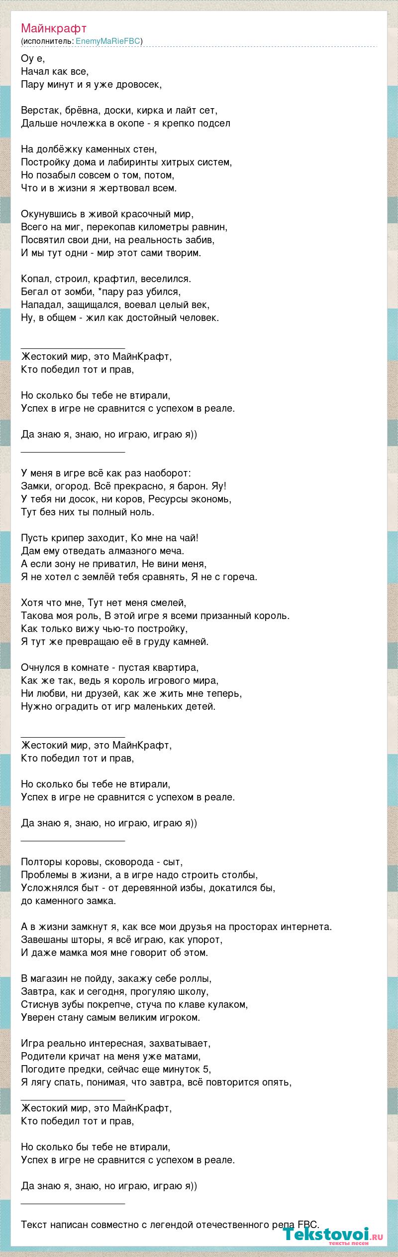 Оу е, Начал как все, Пару минут и я уже дровосек, Верстак, брёвна, доски, кирка и лайт сет, Дальше ночлежка в окопе - я крепко подсел На долбёжку каменных стен, Постройку дома и лабиринты хитрых систем, Но позабыл совсем о том, потом, Что и в жизни я жертвовал всем. Окунувшись в живой красочный мир, Всего на миг, перекопав километры равнин, Посвятил свои дни, на реальность забив, И мы тут одни - мир этот сами творим. Копал, строил, крафтил, веселился. Бегал от зомби, *пару раз убился, Нападал, защищался, воевал целый век, Ну, в общем - жил как достойный человек. ___________________ Жестокий мир, это МайнКрафт, Кто победил тот и прав, Но сколько бы тебе не втирали, Успех в игре не сравнится с успехом в реале. Да знаю я, знаю, но играю, играю я)) ___________________ У меня в игре всё как раз наоборот: Замки, огород. Всё прекрасно, я барон. Яу! У тебя ни досок, ни коров, Ресурсы экономь, Тут без них ты полный ноль. Пусть крипер заходит, Ко мне на чай! Дам ему отведать алмазного меча. А если зону не приватил, Не вини меня, Я не хотел с землёй тебя сравнять, Я не с гореча. Хотя что мне, Тут нет меня смелей, Такова моя роль, В этой игре я всеми призанный король. Как только вижу чью-то постройку, Я тут же превращаю её в груду камней. Очнулся в комнате - пустая квартира, Как же так, ведь я король игрового мира, Ни любви, ни друзей, как же жить мне теперь, Нужно оградить от игр маленьких детей. ___________________ Жестокий мир, это МайнКрафт, Кто победил тот и прав, Но сколько бы тебе не втирали, Успех в игре не сравнится с успехом в реале. Да знаю я, знаю, но играю, играю я)) ___________________ Полторы коровы, сковорода - сыт, Проблемы в жизни, а в игре надо строить столбы, Усложнялся быт - от деревянной избы, докатился бы, до каменного замка. А в жизни замкнут я, как все мои друзья на просторах интернета. Завешаны шторы, я всё играю, как упорот, И даже мамка моя мне говорит об этом. В магазин не пойду, закажу себе роллы, Завтра, как и сегодня, прогуляю школу, Стиснув зубы покрепче, стуча по клаве кулаком, Уверен стану самым великим игроком. Игра реально интересная, захватывает, Родители кричат на меня уже матами, Погодите предки, сейчас еще минуток 5, Я лягу спать, понимая, что завтра, всё повторится опять, ___________________ Жестокий мир, это МайнКрафт, Кто победил тот и прав, Но сколько бы тебе не втирали, Успех в игре не сравнится с успехом в реале. Да знаю я, знаю, но играю, играю я)) ___________________ Текст написан совместно с легендой отечественного репа FBC.