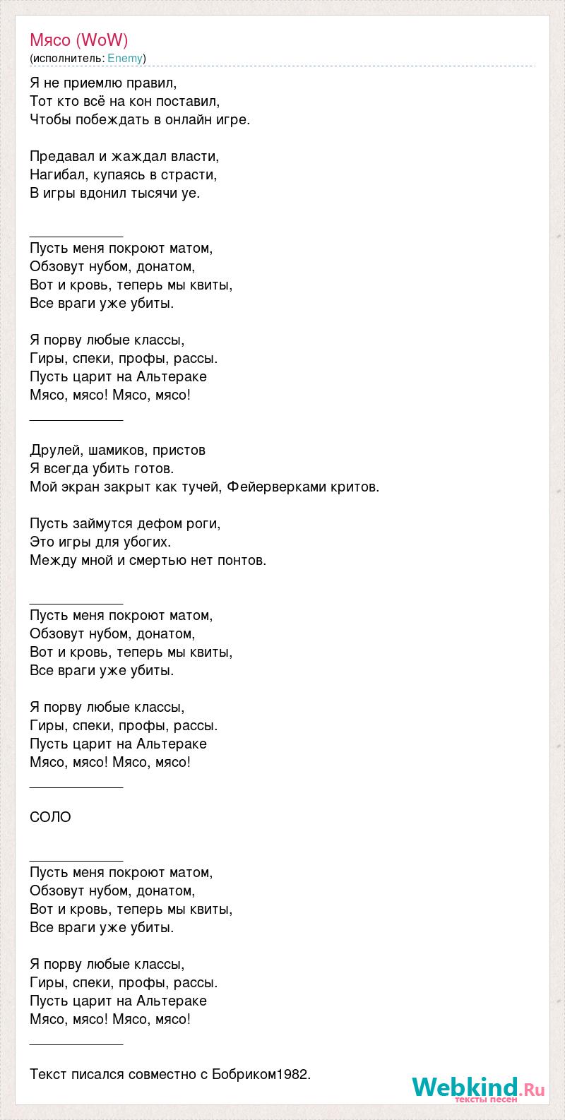 Я не приемлю правил, Тот кто всё на кон поставил, Чтобы побеждать в онлайн игре. Предавал и жаждал власти, Нагибал, купаясь в страсти, В игры вдонил тысячи уе. ____________ Пусть меня покроют матом, Обзовут нубом, донатом, Вот и кровь, теперь мы квиты, Все враги уже убиты. Я порву любые классы, Гиры, спеки, профы, рассы. Пусть царит на Альтераке Мясо, мясо! Мясо, мясо! ____________ Друлей, шамиков, пристов Я всегда убить готов. Мой экран закрыт как тучей, Фейерверками критов. Пусть займутся дефом роги, Это игры для убогих. Между мной и смертью нет понтов. ____________ Пусть меня покроют матом, Обзовут нубом, донатом, Вот и кровь, теперь мы квиты, Все враги уже убиты. Я порву любые классы, Гиры, спеки, профы, рассы. Пусть царит на Альтераке Мясо, мясо! Мясо, мясо! ____________ СОЛО ____________ Пусть меня покроют матом, Обзовут нубом, донатом, Вот и кровь, теперь мы квиты, Все враги уже убиты. Я порву любые классы, Гиры, спеки, профы, рассы. Пусть царит на Альтераке Мясо, мясо! Мясо, мясо! ____________ Текст писался совместно с Бобриком1982.