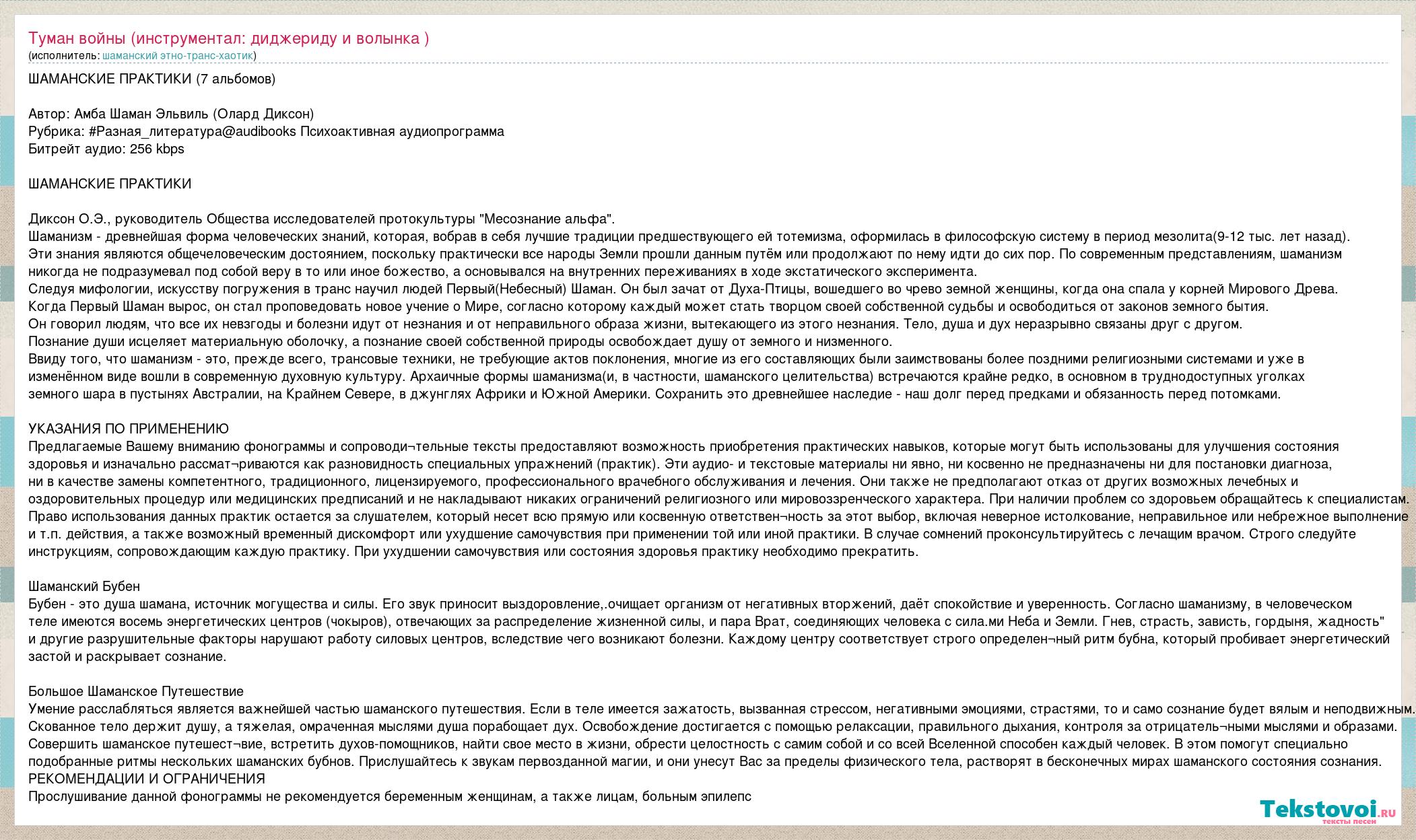 ШАМАНСКИЕ ПРАКТИКИ (7 альбомов) Автор: Амба Шаман Эльвиль (Олард Диксон) Рубрика: #Разная_литература@audibooks Психоактивная аудиопрограмма Битрейт аудио: 256 kbps ШАМАНСКИЕ ПРАКТИКИ Диксон О.Э., руководитель Общества исследователей протокультуры "Месознание альфа". Шаманизм - древнейшая форма человеческих знаний, которая, вобрав в себя лучшие традиции предшествующего ей тотемизма, оформилась в философскую систему в период мезолита(9-12 тыс. лет назад). Эти знания являются общечеловеческим достоянием, поскольку практически все народы Земли прошли данным путём или продолжают по нему идти до сих пор. По современным представлениям, шаманизм никогда не подразумевал под собой веру в то или иное божество, а основывался на внутренних переживаниях в ходе экстатического эксперимента. Следуя мифологии, искусству погружения в транс научил людей Первый(Небесный) Шаман. Он был зачат от Духа-Птицы, вошедшего во чрево земной женщины, когда она спала у корней Мирового Древа. Когда Первый Шаман вырос, он стал проповедовать новое учение о Мире, согласно которому каждый может стать творцом своей собственной судьбы и освободиться от законов земного бытия. Он говорил людям, что все их невзгоды и болезни идут от незнания и от неправильного образа жизни, вытекающего из этого незнания. Тело, душа и дух неразрывно связаны друг с другом. Познание души исцеляет материальную оболочку, а познание своей собственной природы освобождает душу от земного и низменного. Ввиду того, что шаманизм - это, прежде всего, трансовые техники, не требующие актов поклонения, многие из его составляющих были заимствованы более поздними религиозными системами и уже в изменённом виде вошли в современную духовную культуру. Архаичные формы шаманизма(и, в частности, шаманского целительства) встречаются крайне редко, в основном в труднодоступных уголках земного шара в пустынях Австралии, на Крайнем Севере, в джунглях Африки и Южной Америки. Сохранить это древнейшее наследие - наш долг перед предками и обязанность перед потомками. УКАЗАНИЯ ПО ПРИМЕНЕНИЮ Предлагаемые Вашему вниманию фонограммы и сопроводи¬тельные тексты предоставляют возможность приобретения практических навыков, которые могут быть использованы для улучшения состояния здоровья и изначально рассмат¬риваются как разновидность специальных упражнений (практик). Эти аудио- и текстовые материалы ни явно, ни косвенно не предназначены ни для постановки диагноза, ни в качестве замены компетентного, традиционного, лицензируемого, профессионального врачебного обслуживания и лечения. Они также не предполагают отказ от других возможных лечебных и оздоровительных процедур или медицинских предписаний и не накладывают никаких ограничений религиозного или мировоззренческого характера. При наличии проблем со здоровьем обращайтесь к специалистам. Право использования данных практик остается за слушателем, который несет всю прямую или косвенную ответствен¬ность за этот выбор, включая неверное истолкование, неправильное или небрежное выполнение и т.п. действия, а также возможный временный дискомфорт или ухудшение самочувствия при применении той или иной практики. В случае сомнений проконсультируйтесь с лечащим врачом. Строго следуйте инструкциям, сопровождающим каждую практику. При ухудшении самочувствия или состоян