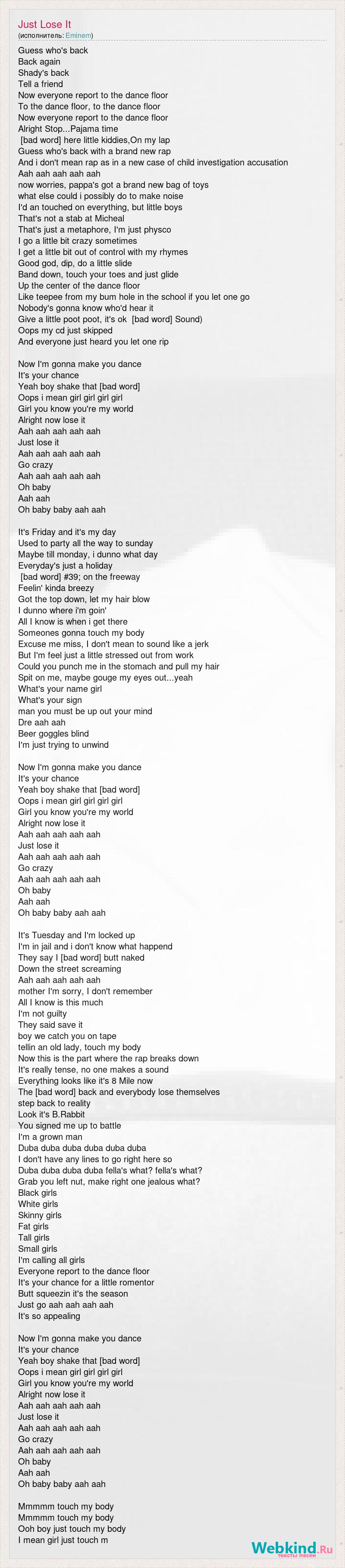 Guess who's back Back again Shady's back Tell a friend Now everyone report to the dance floor To the dance floor, to the dance floor Now everyone report to the dance floor Alright Stop...Pajama time [bad word] here little kiddies,On my lap Guess who's back with a brand new rap And i don't mean rap as in a new case of child investigation accusation Aah aah aah aah aah now worries, pappa's got a brand new bag of toys what else could i possibly do to make noise I'd an touched on everything, but little boys That's not a stab at Micheal That's just a metaphore, I'm just physco I go a little bit crazy sometimes I get a little bit out of control with my rhymes Good god, dip, do a little slide Band down, touch your toes and just glide Up the center of the dance floor Like teepee from my bum hole in the school if you let one go Nobody's gonna know who'd hear it Give a little poot poot, it's ok [bad word] Sound) Oops my cd just skipped And everyone just heard you let one rip Now I'm gonna make you dance It's your chance Yeah boy shake that [bad word] Oops i mean girl girl girl girl Girl you know you're my world Alright now lose it Aah aah aah aah aah Just lose it Aah aah aah aah aah Go crazy Aah aah aah aah aah Oh baby Aah aah Oh baby baby aah aah It's Friday and it's my day Used to party all the way to sunday Maybe till monday, i dunno what day Everyday's just a holiday [bad word] #39; on the freeway Feelin' kinda breezy Got the top down, let my hair blow I dunno where i'm goin' All I know is when i get there Someones gonna touch my body Excuse me miss, I don't mean to sound like a jerk But I'm feel just a little stressed out from work Could you punch me in the stomach and pull my hair Spit on me, maybe gouge my eyes out...yeah What's your name girl What's your sign man you must be up out your mind Dre aah aah Beer goggles blind I'm just trying to unwind Now I'm gonna make you dance It's your chance Yeah boy shake that [bad word] Oops i mean girl girl girl girl Girl you know you're my world Alright now lose it Aah aah aah aah aah Just lose it Aah aah aah aah aah Go crazy Aah aah aah aah aah Oh baby Aah aah Oh baby baby aah aah It's Tuesday and I'm locked up I'm in jail and i don't know what happend They say I [bad word] butt naked Down the street screaming Aah aah aah aah aah mother I'm sorry, I don't remember All I know is this much I'm not guilty They said save it boy we catch you on tape tellin an old lady, touch my body Now this is the part where the rap breaks down It's really tense, no one makes a sound Everything looks like it's 8 Mile now The [bad word] back and everybody lose themselves step back to reality Look it's B.Rabbit You signed me up to battle I'm a grown man Duba duba duba duba duba duba I don't have any lines to go right here so Duba duba duba duba fella's what? fella's what? Grab you left nut, make right one jealous what? Black girls White girls Skinny girls Fat girls Tall girls Small girls I'm calling all girls Everyone report to the dance floor It's your chance for a little romentor Butt squeezin it's the season Just go aah aah aah aah It's so appealing Now I'm gonna make you dance It's your chance Yeah boy shake that [bad word] Oops i mean girl girl girl girl Girl you know you're my world Alright now lose it Aah aah aah aah aah Just lose it Aah aah aah aah aah Go crazy Aah aah aah aah aah Oh baby Aah aah Oh baby baby aah aah Mmmmm touch my body Mmmmm touch my body Ooh boy just touch my body I mean girl just touch m