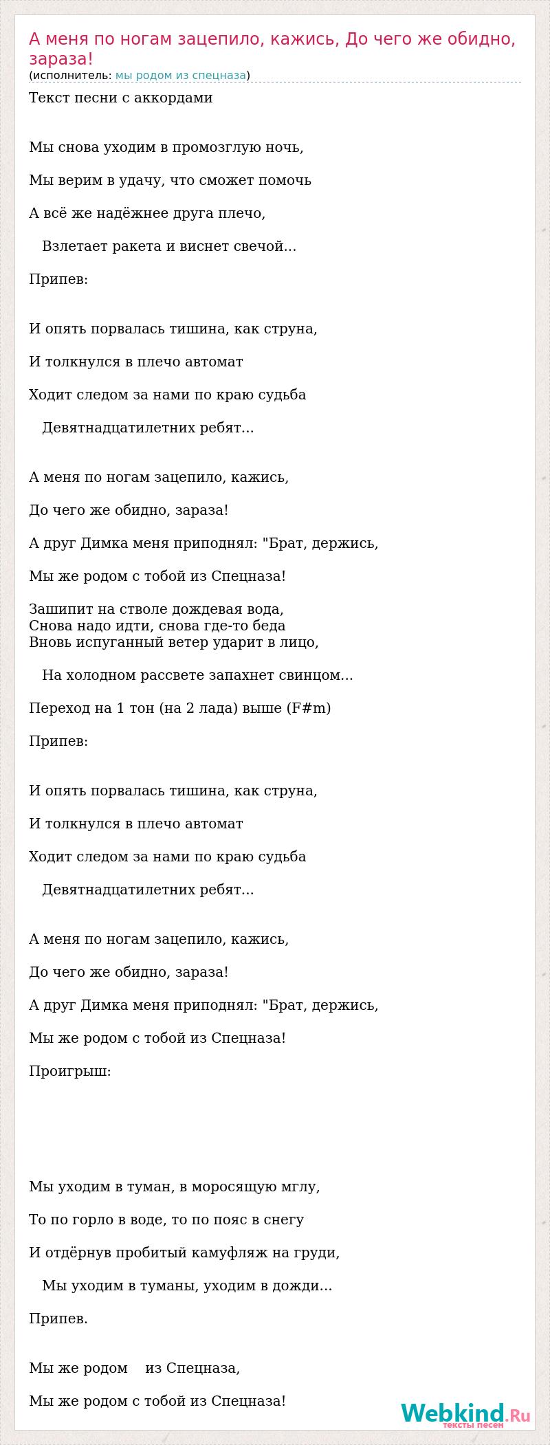 Главная→Исполнители→Мы родом из спецназа→А меня по ногам зацепило, кажись, До чего же обидно, зараза!