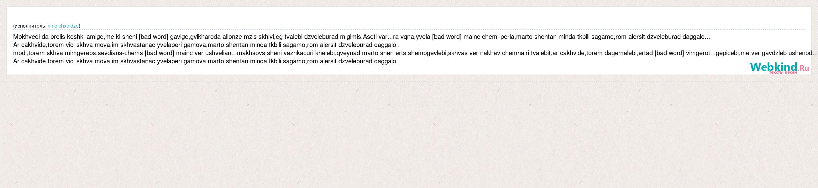 Mokhvedi da brolis koshki amige,me ki sheni [bad word] gavige,gvikharoda alionze mzis skhivi,eg tvalebi dzveleburad migimis.Aseti var...ra vqna,yvela [bad word] mainc chemi peria,marto shentan minda tkbili sagamo,rom alersit dzveleburad daggalo... Ar cakhvide,torem vici skhva mova,im skhvastanac yvelaperi gamova,marto shentan minda tkbili sagamo,rom alersit dzveleburad daggalo.. modi,torem skhva mimgerebs,sevdians-chems [bad word] mainc ver ushvelian...makhsovs sheni vazhkacuri khelebi,qveynad marto shen erts shemogevlebi,skhvas ver nakhav chemnairi tvalebit,ar cakhvide,torem dagemalebi,ertad [bad word] vimgerot...gepicebi,me ver gavdzleb ushenod... Ar cakhvide,torem vici skhva mova,im skhvastanac yvelaperi gamova,marto shentan minda tkbili sagamo,rom alersit dzveleburad daggalo...
