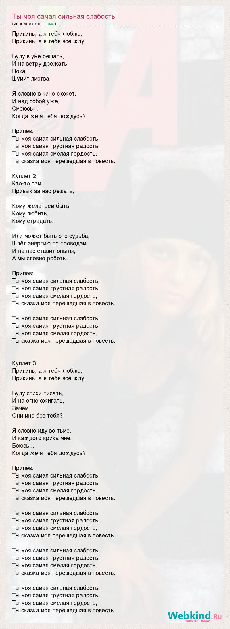 Прикинь, а я тебя люблю, Прикинь, а я тебя всё жду, Буду в уме решать, И на ветру дрожать, Пока Шумит листва. Я словно в кино сюжет, И над собой уже, Смеюсь… Когда же я тебя дождусь? Припев: Ты моя самая сильная слабость, Ты моя самая грустная радость, Ты моя самая смелая гордость, Ты сказка моя перешедшая в повесть. Куплет 2: Кто-то там, Привык за нас решать, Кому желаньем быть, Кому любить, Кому страдать. Или может быть это судьба, Шлёт энергию по проводам, И на нас ставит опыты, А мы словно роботы. Припев: Ты моя самая сильная слабость, Ты моя самая грустная радость, Ты моя самая смелая гордость, Ты сказка моя перешедшая в повесть. Ты моя самая сильная слабость, Ты моя самая грустная радость, Ты моя самая смелая гордость, Ты сказка моя перешедшая в повесть. Куплет 3: Прикинь, а я тебя люблю, Прикинь, а я тебя всё жду, Буду стихи писать, И на огне сжигать, Зачем Они мне без тебя? Я словно иду во тьме, И каждого крика мне, Боюсь... Когда же я тебя дождусь? Припев: Ты моя самая сильная слабость, Ты моя самая грустная радость, Ты моя самая смелая гордость, Ты сказка моя перешедшая в повесть. Ты моя самая сильная слабость, Ты моя самая грустная радость, Ты моя самая смелая гордость, Ты сказка моя перешедшая в повесть. Ты моя самая сильная слабость, Ты моя самая грустная радость, Ты моя самая смелая гордость, Ты сказка моя перешедшая в повесть. Ты моя самая сильная слабость, Ты моя самая грустная радость, Ты моя самая смелая гордость, Ты сказка моя перешедшая в повесть