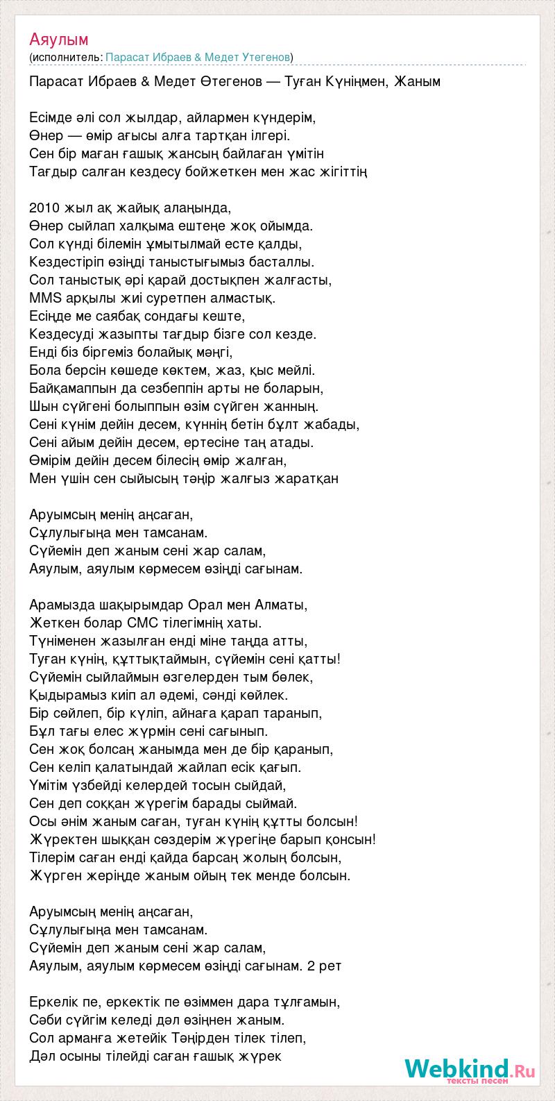 Парасат Ибраев & Медет Өтегенов — Туған Күніңмен, Жаным Есімде әлі сол жылдар, айлармен күндерім, Өнер — өмір ағысы алға тартқан ілгері. Сен бір маған ғашық жансың байлаған үмітін Тағдыр салған кездесу бойжеткен мен жас жігіттің 2010 жыл ақ жайық алаңында, Өнер сыйлап халқыма ештеңе жоқ ойымда. Сол күнді білемін ұмытылмай есте қалды, Кездестіріп өзіңді таныстығымыз басталлы. Сол таныстық әрі қарай достықпен жалғасты, ММS арқылы жиі суретпен алмастық. Есіңде ме саябақ сондағы кеште, Кездесуді жазыпты тағдыр бізге сол кезде. Енді біз біргеміз болайық мәңгі, Бола берсін көшеде көктем, жаз, қыс мейлі. Байқамаппын да сезбеппін арты не боларын, Шын сүйгені болыппын өзім сүйген жанның. Сені күнім дейін десем, күннің бетін бұлт жабады, Сені айым дейін десем, ертесіне таң атады. Өмірім дейін десем білесің өмір жалған, Мен үшін сен сыйысың тәңір жалғыз жаратқан Аруымсың менің аңсаған, Сұлулығыңа мен тамсанам. Сүйемін деп жаным сені жар салам, Аяулым, аяулым көрмесем өзіңді сағынам. Арамызда шақырымдар Орал мен Алматы, Жеткен болар СМС тілегімнің хаты. Түніменен жазылған енді міне таңда атты, Туған күнің, құттықтаймын, сүйемін сені қатты! Сүйемін сыйлаймын өзгелерден тым бөлек, Қыдырамыз киіп ал әдемі, сәнді көйлек. Бір сөйлеп, бір күліп, айнаға қарап таранып, Бұл тағы елес жүрмін сені сағынып. Сен жоқ болсаң жанымда мен де бір қаранып, Сен келіп қалатындай жайлап есік қағып. Үмітім үзбейді келердей тосын сыйдай, Сен деп соққан жүрегім барады сыймай. Осы әнім жаным саған, туған күнің құтты болсын! Жүректен шыққан сөздерім жүрегіңе барып қонсын! Тілерім саған енді қайда барсаң жолың болсын, Жүрген жеріңде жаным ойың тек менде болсын. Аруымсың менің аңсаған, Сұлулығыңа мен тамсанам. Сүйемін деп жаным сені жар салам, Аяулым, аяулым көрмесем өзіңді сағынам. 2 рет Еркелік пе, еркектік пе өзіммен дара тұлғамын, Сәби сүйгім келеді дәл өзіңнен жаным. Сол арманға жетейік Тәңірден тілек тілеп, Дәл осыны тілейді саған ғашық жүрек