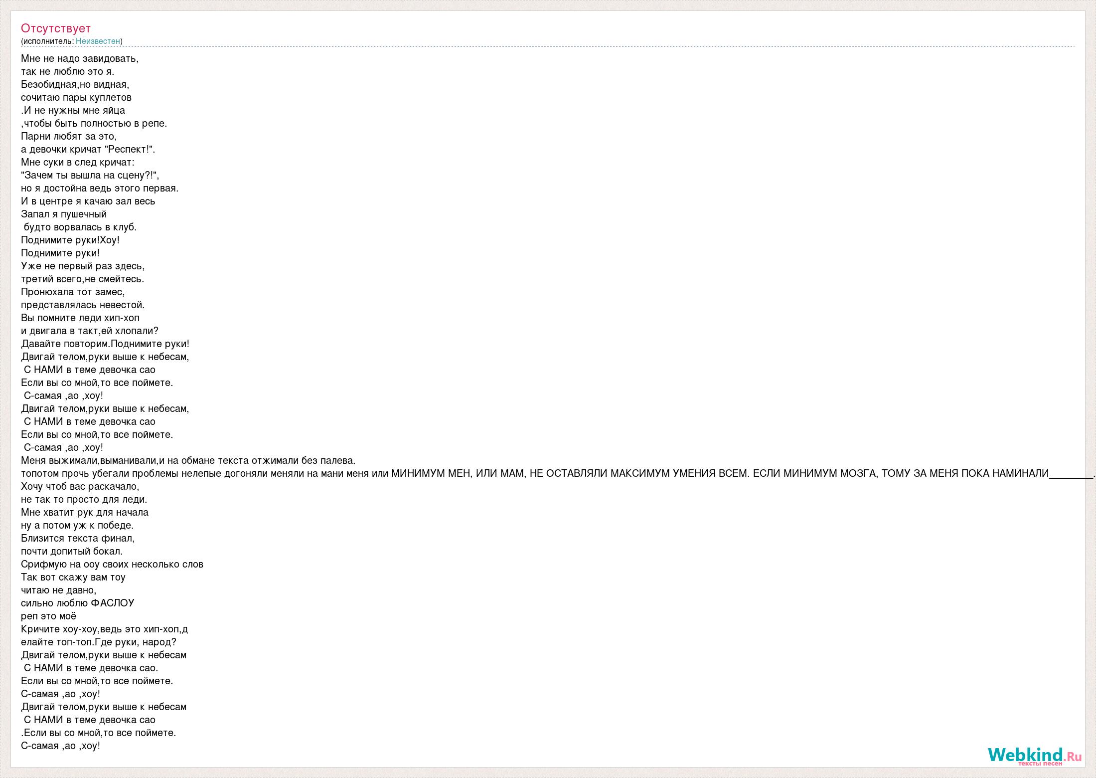 Мне не надо завидовать, так не люблю это я. Безобидная,но видная, сочитаю пары куплетов .И не нужны мне яйца ,чтобы быть полностью в репе. Парни любят за это, а девочки кричат "Респект!". Мне суки в след кричат: "Зачем ты вышла на сцену?!", но я достойна ведь этого первая. И в центре я качаю зал весь Запал я пушечный будто ворвалась в клуб. Поднимите руки!Хоу! Поднимите руки! Уже не первый раз здесь, третий всего,не смейтесь. Пронюхала тот замес, представлялась невестой. Вы помните леди хип-хоп и двигала в такт,ей хлопали? Давайте повторим.Поднимите руки! Двигай телом,руки выше к небесам, С НАМИ в теме девочка сао Если вы со мной,то все поймете. С-самая ,ао ,хоу! Двигай телом,руки выше к небесам, С НАМИ в теме девочка сао Если вы со мной,то все поймете. С-самая ,ао ,хоу! Меня выжимали,выманивали,и на обмане текста отжимали без палева. топотом прочь убегали проблемы нелепые догоняли меняли на мани меня или МИНИМУМ МЕН, ИЛИ МАМ, НЕ ОСТАВЛЯЛИ МАКСИМУМ УМЕНИЯ ВСЕМ. ЕСЛИ МИНИМУМ МОЗГА, ТОМУ ЗА МЕНЯ ПОКА НАМИНАЛИ________. Хочу чтоб вас раскачало, не так то просто для леди. Мне хватит рук для начала ну а потом уж к победе. Близится текста финал, почти допитый бокал. Срифмую на ооу своих несколько слов Так вот скажу вам тоу читаю не давно, сильно люблю ФАСЛОУ реп это моё Кричите хоу-хоу,ведь это хип-хоп,д елайте топ-топ.Где руки, народ? Двигай телом,руки выше к небесам С НАМИ в теме девочка сао. Если вы со мной,то все поймете. С-самая ,ао ,хоу! Двигай телом,руки выше к небесам С НАМИ в теме девочка сао .Если вы со мной,то все поймете. С-самая ,ао ,хоу!