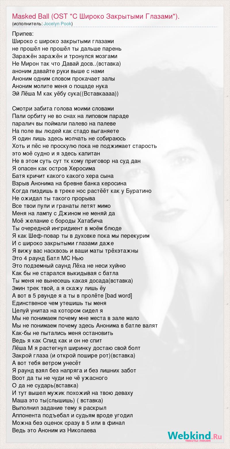 Припев: Широко с широко закрытыми глазами не прошёл не прошёл ты дальше парень Заражён заражён и тронулся мозгами Не Мирон так что Давай досв..(вставка) аноним давайте руки выше с нами Аноним одним словом прокачает залы Аноним молите меня о пощаде нука Эй Лёша М как уёбу сука((Вставкаааа)) Смотри забита голова моими словами Пали орбиту не во снах на липовом параде паралич вы поймали палево на палеве На поле вы людей как стадо выганяете Я один лишь здесь молчать не собираюсь Хоть и пёс не проскулю пока не поджимает старость это моё судно и я здесь капитан Не в этом суть сут тк кому приговор на суд дан Я опасен как остров Херосима Батя кричит какого какого хера сына Взрыв Анонима на бревне банка керосина Когда пиздишь в треке нос растёёт как у Буратино Не ожидал ты такого прорыва Все твои пули и гранаты летят мимо Меня на лампу с Джином не меняй да Моё желание с бороды Хатабича Ты очередной ингридиент в моём блюде Я как Шеф-повар ты в духовке пока мы перекурим И с широко закрытыми глазами даже Я вижу вас насквозь и ваши маты трёхэтажны Это 4 раунд Батл МС Нью Это подземный саунд Лёха не неси хуйню Как бы не старался выкидывая с батла Ты меня не вынесешь какая досада(вставка) 3мин трек твой, а я скажу лишь ёу А вот в 5 рвунде я а ты в пролёте [bad word] Единственое чем утешишь ты меня Целуй унитаз на котором сидел я Мы не понимаем почему мне места в зале мало Мы не понимаем почему здесь Анонима в батле валят Как-бы не пытались меня остановить Ведь я как Спид как и он не спит Лёша М я растегнул ширинку достаю свой болт Закрой глаза (и открой пошире рот)(вставка) А вот тебя ветром унесёт Я раунд взял без напряга и без лишних забот Воот да ты не чуди не чё ужасного О да не сударь(вставка) И тут вышел мужик похожий на твою деваху Маша это ты(слышишь) ( вставка) Выполнил задание тему я раскрыл Аппонента подъебал и судьям вроде угодил Можна без оценок сразу в 5 или в финал Ведь это Аноним из Николаева