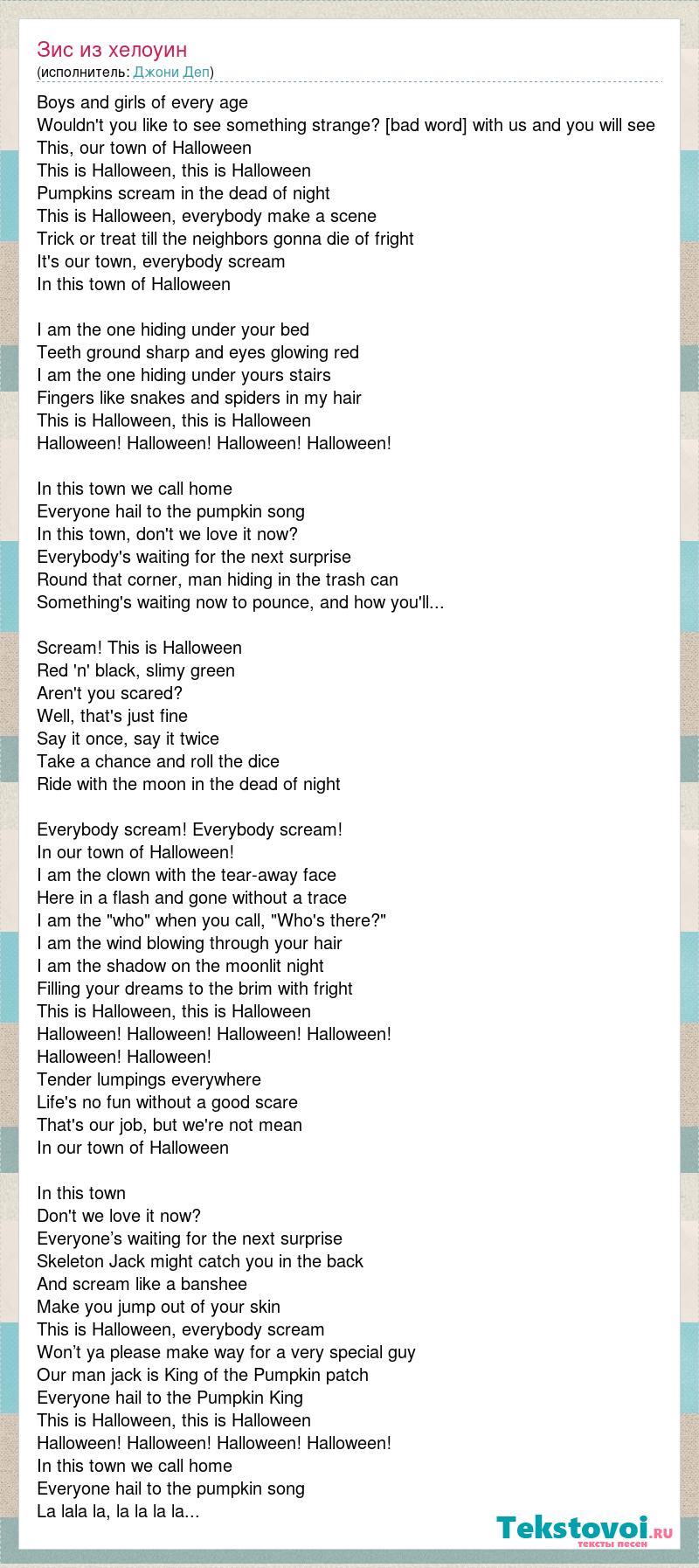 Boys and girls of every age Wouldn't you like to see something strange? [bad word] with us and you will see This, our town of Halloween This is Halloween, this is Halloween Pumpkins scream in the dead of night This is Halloween, everybody make a scene Trick or treat till the neighbors gonna die of fright It's our town, everybody scream In this town of Halloween I am the one hiding under your bed Teeth ground sharp and eyes glowing red I am the one hiding under yours stairs Fingers like snakes and spiders in my hair This is Halloween, this is Halloween Halloween! Halloween! Halloween! Halloween! In this town we call home Everyone hail to the pumpkin song In this town, don't we love it now? Everybody's waiting for the next surprise Round that corner, man hiding in the trash can Something's waiting now to pounce, and how you'll... Scream! This is Halloween Red 'n' black, slimy green Aren't you scared? Well, that's just fine Say it once, say it twice Take a chance and roll the dice Ride with the moon in the dead of night Everybody scream! Everybody scream! In our town of Halloween! I am the clown with the tear-away face Here in a flash and gone without a trace I am the "who" when you call, "Who's there?" I am the wind blowing through your hair I am the shadow on the moonlit night Filling your dreams to the brim with fright This is Halloween, this is Halloween Halloween! Halloween! Halloween! Halloween! Halloween! Halloween! Tender lumpings everywhere Life's no fun without a good scare That's our job, but we're not mean In our town of Halloween In this town Don't we love it now? Everyone’s waiting for the next surprise Skeleton Jack might catch you in the back And scream like a banshee Make you jump out of your skin This is Halloween, everybody scream Won’t ya please make way for a very special guy Our man jack is King of the Pumpkin patch Everyone hail to the Pumpkin King This is Halloween, this is Halloween Halloween! Halloween! Halloween! Halloween! In this town we call home Everyone hail to the pumpkin song La lala la, la la la la...