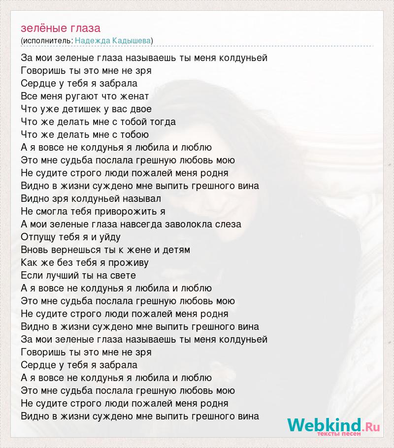 За мои зеленые глаза называешь ты меня колдуньей Говоришь ты это мне не зря Сердце у тебя я забрала Все меня ругают что женат Что уже детишек у вас двое Что же делать мне с тобой тогда Что же делать мне с тобою А я вовсе не колдунья я любила и люблю Это мне судьба послала грешную любовь мою Не судите строго люди пожалей меня родня Видно в жизни суждено мне выпить грешного вина Видно зря колдуньей называл Не смогла тебя приворожить я А мои зеленые глаза навсегда заволокла слеза Отпущу тебя я и уйду Вновь вернешься ты к жене и детям Как же без тебя я проживу Если лучший ты на свете А я вовсе не колдунья я любила и люблю Это мне судьба послала грешную любовь мою Не судите строго люди пожалей меня родня Видно в жизни суждено мне выпить грешного вина За мои зеленые глаза называешь ты меня колдуньей Говоришь ты это мне не зря Сердце у тебя я забрала А я вовсе не колдунья я любила и люблю Это мне судьба послала грешную любовь мою Не судите строго люди пожалей меня родня Видно в жизни суждено мне выпить грешного вина