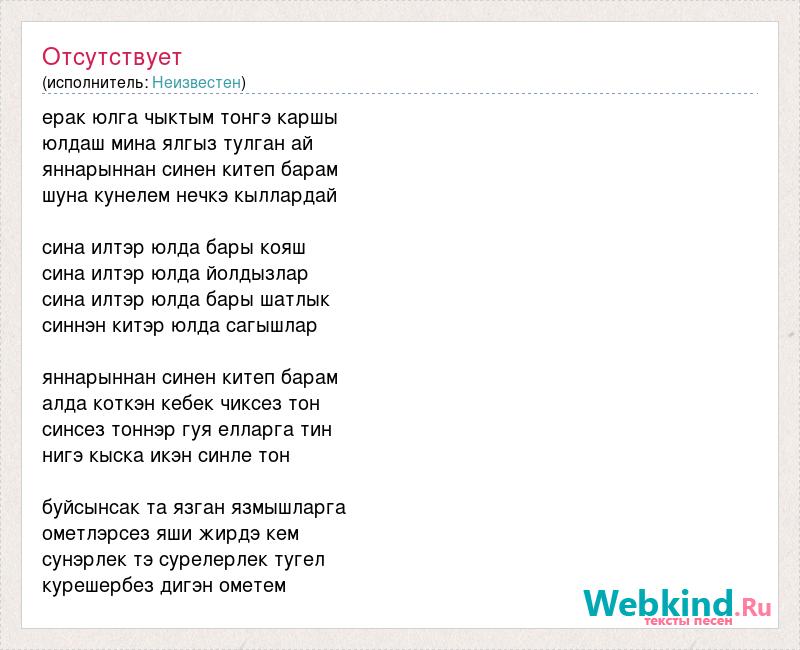 ерак юлга чыктым тонгэ каршы юлдаш мина ялгыз тулган ай яннарыннан синен китеп барам шуна кунелем нечкэ кыллардай сина илтэр юлда бары кояш сина илтэр юлда йолдызлар сина илтэр юлда бары шатлык синнэн китэр юлда сагышлар яннарыннан синен китеп барам алда коткэн кебек чиксез тон синсез тоннэр гуя елларга тин нигэ кыска икэн синле тон буйсынсак та язган язмышларга ометлэрсез яши жирдэ кем сунэрлек тэ сурелерлек тугел курешербез дигэн ометем