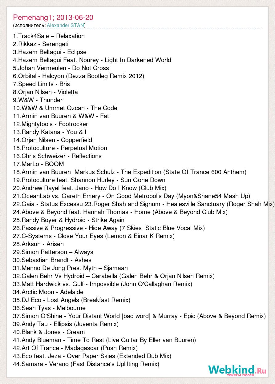 1.Track4Sale – Relaxation 2.Rikkaz - Serengeti 3.Hazem Beltagui - Eclipse 4.Hazem Beltagui Feat. Nourey - Light In Darkened World 5.Johan Vermeulen - Do Not Cross 6.Orbital - Halcyon (Dezza Bootleg Remix 2012) 7.Speed Limits - Bris 8.Orjan Nilsen - Violetta 9.W&W - Thunder 10.W&W & Ummet Ozcan - The Code 11.Armin van Buuren & W&W - Fat 12.Mightyfools - Footrocker 13.Randy Katana - You & I 14.Orjan Nilsen - Copperfield 15.Protoculture - Perpetual Motion 16.Chris Schweizer - Reflections 17.MarLo - BOOM 18.Armin van Buuren Markus Schulz - The Expedition (State Of Trance 600 Anthem) 19.Protoculture feat. Shannon Hurley - Sun Gone Down 20.Andrew Rayel feat. Jano - How Do I Know (Club Mix) 21.OceanLab vs. Gareth Emery - On Good Metropolis Day (Myon&Shane54 Mash Up) 22.Gaia - Status Excessu 23.Roger Shah and Signum - Healesville Sanctuary (Roger Shah Mix) 24.Above & Beyond feat. Hannah Thomas - Home (Above & Beyond Club Mix) 25.Randy Boyer & Hydroid - Strike Again 26.Passive & Progressive - Hide Away (7 Skies Static Blue Vocal Mix) 27.C-Systems - Close Your Eyes (Lemon & Einar K Remix) 28.Arksun - Arisen 29.Simon Patterson – Always 30.Sebastian Brandt - Ashes 31.Menno De Jong Pres. Myth – Sjamaan 32.Galen Behr Vs Hydroid – Carabella (Galen Behr & Orjan Nilsen Remix) 33.Matt Hardwick vs. Gulf - Impossible (John O'Callaghan Remix) 34.Arctic Moon - Adelaide 35.DJ Eco - Lost Angels (Breakfast Remix) 36.Sean Tyas - Melbourne 37.Simon O'Shine - Your Distant World [bad word] & Murray - Epic (Above & Beyond Remix) 39.Andy Tau - Ellipsis (Juventa Remix) 40.Blank & Jones - Cream 41.Andy Blueman - Time To Rest (Live Guitar By Eller van Buuren) 42.Art Of Trance - Madagascar (Push Remix) 43.Eco feat. Jeza - Over Paper Skies (Extended Dub Mix) 44.Samara - Verano (Fast Distance's Uplifting Remix)