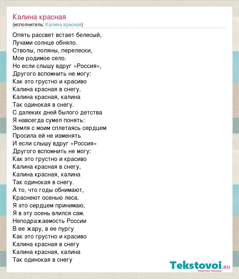 Опять рассвет встает белесый, Лучами солнце обняло. Стволы, поляны, перелески, Мое родимое село. Но если слышу вдруг «Россия», Другого вспомнить не могу: Как это грустно и красиво Калина красная в снегу, Калина красная, калина Так одинокая в снегу. С далеких дней былого детства Я навсегда сумел понять: Земля с моим сплетаясь сердцем Просила ей не изменять И если слышу вдруг «Россия» Другого вспомнить не могу: Как это грустно и красиво Калина красная в снегу, Калина красная, калина Так одинокая в снегу. А то, что годы обнимают, Краснеют осенью леса. Я это сердцем принимаю, Я в эту осень влился сам. Неподражаемость России В ее жару, в ее пургу Как это грустно и красиво Калина красная в снегу Калина красная, калина Так одинокая в снегу