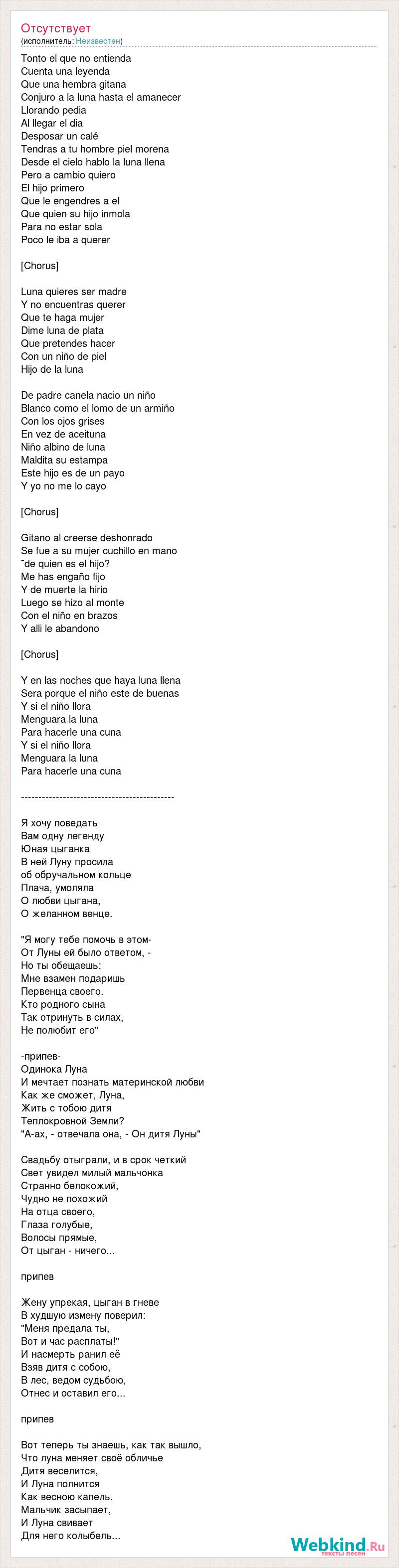 Tonto el que no entienda Cuenta una leyenda Que una hembra gitana Conjuro a la luna hasta el amanecer Llorando pedia Al llegar el dia Desposar un calé Tendras a tu hombre piel morena Desde el cielo hablo la luna llena Pero a cambio quiero El hijo primero Que le engendres a el Que quien su hijo inmola Para no estar sola Poco le iba a querer [Chorus] Luna quieres ser madre Y no encuentras querer Que te haga mujer Dime luna de plata Que pretendes hacer Con un niño de piel Hijo de la luna De padre canela nacio un niño Blanco como el lomo de un armiño Con los ojos grises En vez de aceituna Niño albino de luna Maldita su estampa Este hijo es de un payo Y yo no me lo cayo [Chorus] Gitano al creerse deshonrado Se fue a su mujer cuchillo en mano ¯de quien es el hijo? Me has engaño fijo Y de muerte la hirio Luego se hizo al monte Con el niño en brazos Y alli le abandono [Chorus] Y en las noches que haya luna llena Sera porque el niño este de buenas Y si el niño llora Menguara la luna Para hacerle una cuna Y si el niño llora Menguara la luna Para hacerle una cuna -------------------------------------------- Я хочу поведать Вам одну легенду Юная цыганка В ней Луну просила об обручальном кольце Плача, умоляла О любви цыгана, О желанном венце. "Я могу тебе помочь в этом- От Луны ей было ответом, - Но ты обещаешь: Мне взамен подаришь Первенца своего. Кто родного сына Так отринуть в силах, Не полюбит его" -припев- Одинока Луна И мечтает познать материнской любви Как же сможет, Луна, Жить с тобою дитя Теплокровной Земли? "А-ах, - отвечала она, - Он дитя Луны" Свадьбу отыграли, и в срок четкий Свет увидел милый мальчонка Странно белокожий, Чудно не похожий На отца своего, Глаза голубые, Волосы прямые, От цыган - ничего... припев Жену упрекая, цыган в гневе В худшую измену поверил: "Меня предала ты, Вот и час расплаты!" И насмерть ранил её Взяв дитя с собою, В лес, ведом судьбою, Отнес и оставил его... припев Вот теперь ты знаешь, как так вышло, Что луна меняет своё обличье Дитя веселится, И Луна полнится Как весною капель. Мальчик засыпает, И Луна свивает Для него колыбель...