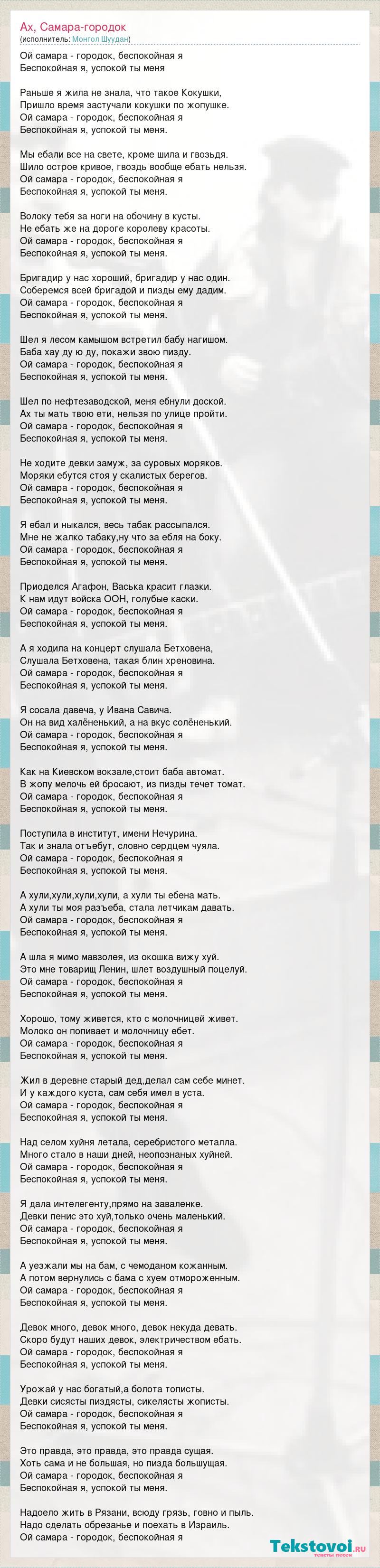 Ой самара - городок, беспокойная я Беспокойная я, успокой ты меня Раньше я жила не знала, что такое Кокушки, Пришло время застучали кокушки по жопушке. Ой самара - городок, беспокойная я Беспокойная я, успокой ты меня. Мы ебали все на свете, кроме шила и гвозьдя. Шило острое кривое, гвоздь вообще ебать нельзя. Ой самара - городок, беспокойная я Беспокойная я, успокой ты меня. Волоку тебя за ноги на обочину в кусты. Не ебать же на дороге королеву красоты. Ой самара - городок, беспокойная я Беспокойная я, успокой ты меня. Бригадир у нас хороший, бригадир у нас один. Соберемся всей бригадой и пизды ему дадим. Ой самара - городок, беспокойная я Беспокойная я, успокой ты меня. Шел я лесом камышом встретил бабу нагишом. Баба хау ду ю ду, покажи звою пизду. Ой самара - городок, беспокойная я Беспокойная я, успокой ты меня. Шел по нефтезаводской, меня ебнули доской. Ах ты мать твою ети, нельзя по улице пройти. Ой самара - городок, беспокойная я Беспокойная я, успокой ты меня. Не ходите девки замуж, за суровых моряков. Моряки ебутся стоя у скалистых берегов. Ой самара - городок, беспокойная я Беспокойная я, успокой ты меня. Я ебал и ныкался, весь табак рассыпался. Мне не жалко табаку,ну что за ебля на боку. Ой самара - городок, беспокойная я Беспокойная я, успокой ты меня. Приоделся Агафон, Васька красит глазки. К нам идут войска ООН, голубые каски. Ой самара - городок, беспокойная я Беспокойная я, успокой ты меня. А я ходила на концерт слушала Бетховена, Слушала Бетховена, такая блин хреновина. Ой самара - городок, беспокойная я Беспокойная я, успокой ты меня. Я сосала давеча, у Ивана Савича. Он на вид халёненький, а на вкус солёненький. Ой самара - городок, беспокойная я Беспокойная я, успокой ты меня. Как на Киевском вокзале,стоит баба автомат. В жопу мелочь ей бросают, из пизды течет томат. Ой самара - городок, беспокойная я Беспокойная я, успокой ты меня. Поступила в институт, имени Нечурина. Так и знала отъебут, словно сердцем чуяла. Ой самара - городок, беспокойная я Беспокойная я, успокой ты меня. А хули,хули,хули,хули, а хули ты ебена мать. А хули ты моя разъеба, стала летчикам давать. Ой самара - городок, беспокойная я Беспокойная я, успокой ты меня. А шла я мимо мавзолея, из окошка вижу хуй. Это мне товарищ Ленин, шлет воздушный поцелуй. Ой самара - городок, беспокойная я Беспокойная я, успокой ты меня. Хорошо, тому живется, кто с молочницей живет. Молоко он попивает и молочницу ебет. Ой самара - городок, беспокойная я Беспокойная я, успокой ты меня. Жил в деревне старый дед,делал сам себе минет. И у каждого куста, сам себя имел в уста. Ой самара - городок, беспокойная я Беспокойная я, успокой ты меня. Над селом хуйня летала, серебристого металла. Много стало в наши дней, неопознаных хуйней. Ой самара - городок, беспокойная я Беспокойная я, успокой ты меня. Я дала интелегенту,прямо на заваленке. Девки пенис это хуй,только очень маленький. Ой самара - городок, беспокойная я Беспокойная я, успокой ты меня. А уезжали мы на бам, с чемоданом кожанным. А потом вернулись с бама с хуем отмороженным. Ой самара - городок, беспокойная я Беспокойная я, успокой ты меня. Девок много, девок много, девок некуда девать. Скоро будут наших девок, электричеством ебать. Ой самара - городок, беспокойная я Беспокойная я, успокой ты меня. Урожай у нас богатый,а болота тописты. Девки сисясты пиздясты, сикелясты жописты. Ой