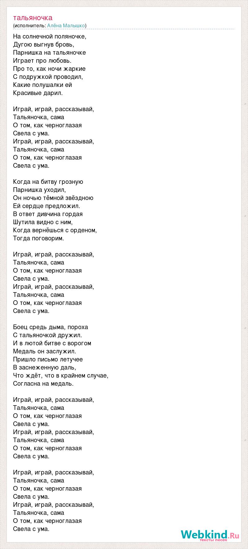 На солнечной поляночке, Дугою выгнув бровь, Парнишка на тальяночке Играет про любовь. Про то, как ночи жаркие С подружкой проводил, Какие полушалки ей Красивые дарил. Играй, играй, рассказывай, Тальяночка, сама О том, как черноглазая Свела с ума. Играй, играй, рассказывай, Тальяночка, сама О том, как черноглазая Свела с ума. Когда на битву грозную Парнишка уходил, Он ночью тёмной звёздною Ей сердце предложил. В ответ дивчина гордая Шутила видно с ним, Когда вернёшься с орденом, Тогда поговорим. Играй, играй, рассказывай, Тальяночка, сама О том, как черноглазая Свела с ума. Играй, играй, рассказывай, Тальяночка, сама О том, как черноглазая Свела с ума. Боец средь дыма, пороха С тальяночкой дружил. И в лютой битве с ворогом Медаль он заслужил. Пришло письмо летучее В заснеженную даль, Что ждёт, что в крайнем случае, Согласна на медаль. Играй, играй, рассказывай, Тальяночка, сама О том, как черноглазая Свела с ума. Играй, играй, рассказывай, Тальяночка, сама О том, как черноглазая Свела с ума. Играй, играй, рассказывай, Тальяночка, сама О том, как черноглазая Свела с ума. Играй, играй, рассказывай, Тальяночка, сама О том, как черноглазая Свела с ума.