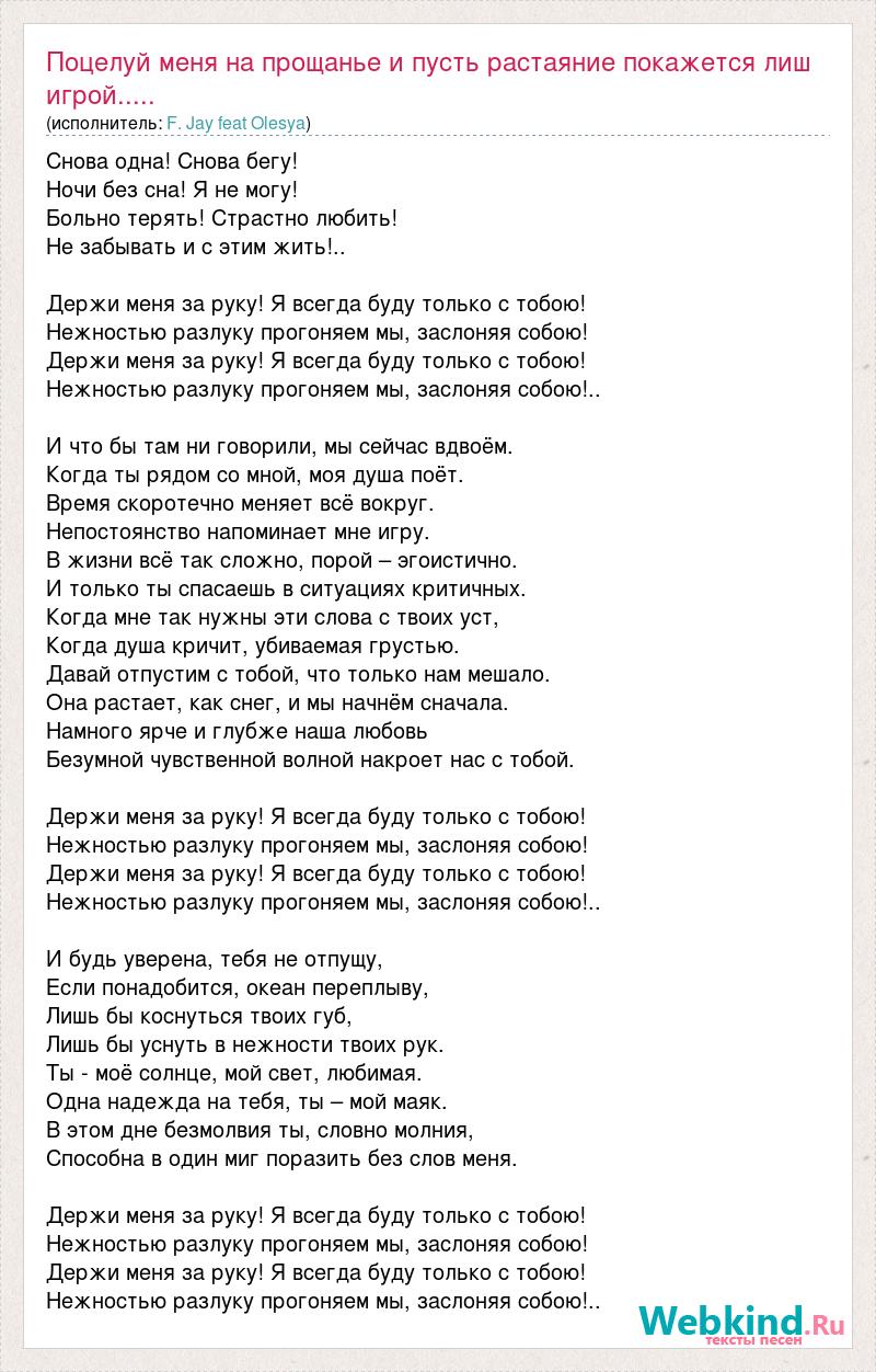 Снова одна! Снова бегу! Ночи без сна! Я не могу! Больно терять! Страстно любить! Не забывать и с этим жить!.. Держи меня за руку! Я всегда буду только с тобою! Нежностью разлуку прогоняем мы, заслоняя собою! Держи меня за руку! Я всегда буду только с тобою! Нежностью разлуку прогоняем мы, заслоняя собою!.. И что бы там ни говорили, мы сейчас вдвоём. Когда ты рядом со мной, моя душа поёт. Время скоротечно меняет всё вокруг. Непостоянство напоминает мне игру. В жизни всё так сложно, порой – эгоистично. И только ты спасаешь в ситуациях критичных. Когда мне так нужны эти слова с твоих уст, Когда душа кричит, убиваемая грустью. Давай отпустим с тобой, что только нам мешало. Она растает, как снег, и мы начнём сначала. Намного ярче и глубже наша любовь Безумной чувственной волной накроет нас с тобой. Держи меня за руку! Я всегда буду только с тобою! Нежностью разлуку прогоняем мы, заслоняя собою! Держи меня за руку! Я всегда буду только с тобою! Нежностью разлуку прогоняем мы, заслоняя собою!.. И будь уверена, тебя не отпущу, Если понадобится, океан переплыву, Лишь бы коснуться твоих губ, Лишь бы уснуть в нежности твоих рук. Ты - моё солнце, мой свет, любимая. Одна надежда на тебя, ты – мой маяк. В этом дне безмолвия ты, словно молния, Способна в один миг поразить без слов меня. Держи меня за руку! Я всегда буду только с тобою! Нежностью разлуку прогоняем мы, заслоняя собою! Держи меня за руку! Я всегда буду только с тобою! Нежностью разлуку прогоняем мы, заслоняя собою!..