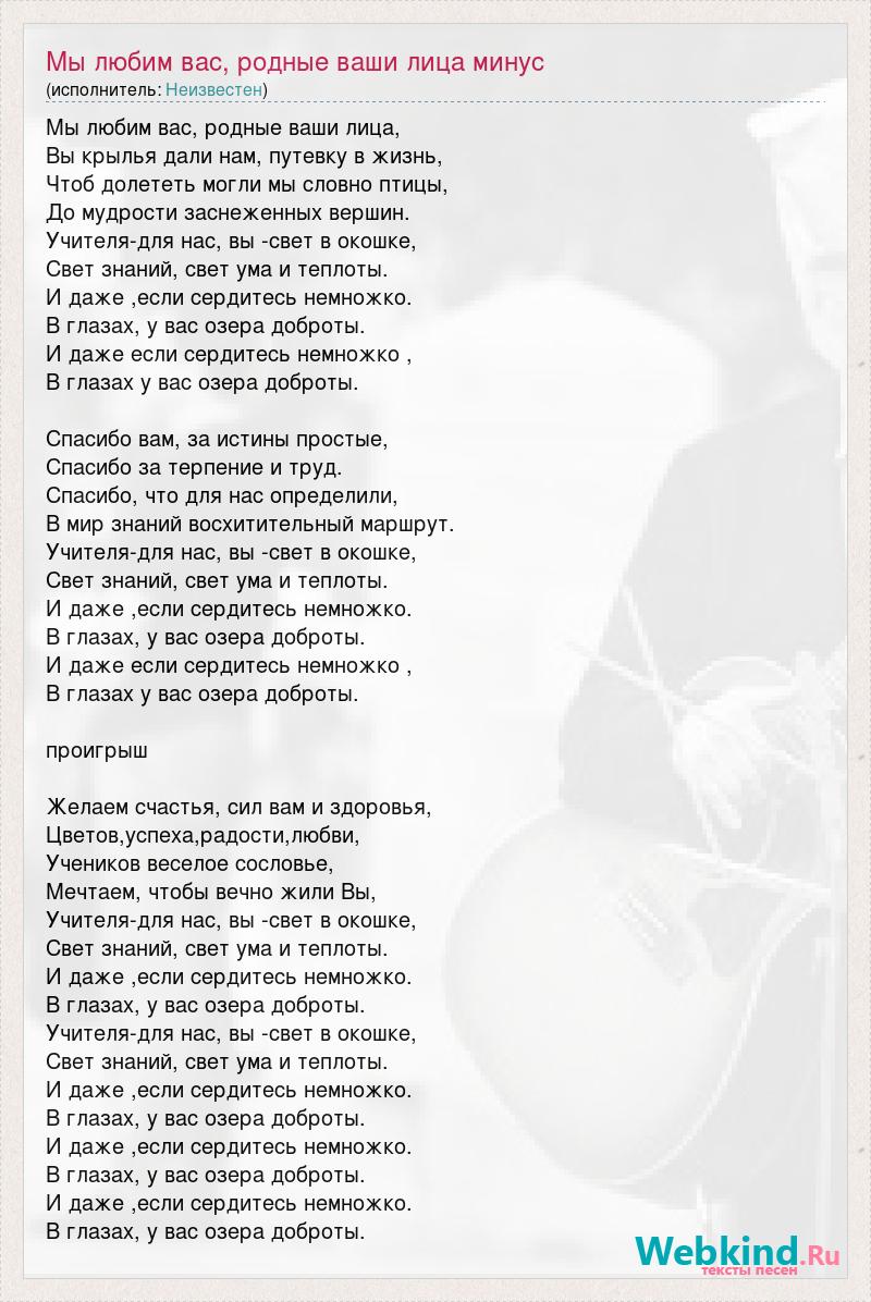 Мы любим вас, родные ваши лица, Вы крылья дали нам, путевку в жизнь, Чтоб долететь могли мы словно птицы, До мудрости заснеженных вершин. Учителя-для нас, вы -свет в окошке, Свет знаний, свет ума и теплоты. И даже ,если сердитесь немножко. В глазах, у вас озера доброты. И даже если сердитесь немножко , В глазах у вас озера доброты. Спасибо вам, за истины простые, Спасибо за терпение и труд. Спасибо, что для нас определили, В мир знаний восхитительный маршрут. Учителя-для нас, вы -свет в окошке, Свет знаний, свет ума и теплоты. И даже ,если сердитесь немножко. В глазах, у вас озера доброты. И даже если сердитесь немножко , В глазах у вас озера доброты. проигрыш Желаем счастья, сил вам и здоровья, Цветов,успеха,радости,любви, Учеников веселое сословье, Мечтаем, чтобы вечно жили Вы, Учителя-для нас, вы -свет в окошке, Свет знаний, свет ума и теплоты. И даже ,если сердитесь немножко. В глазах, у вас озера доброты. Учителя-для нас, вы -свет в окошке, Свет знаний, свет ума и теплоты. И даже ,если сердитесь немножко. В глазах, у вас озера доброты. И даже ,если сердитесь немножко. В глазах, у вас озера доброты. И даже ,если сердитесь немножко. В глазах, у вас озера доброты.