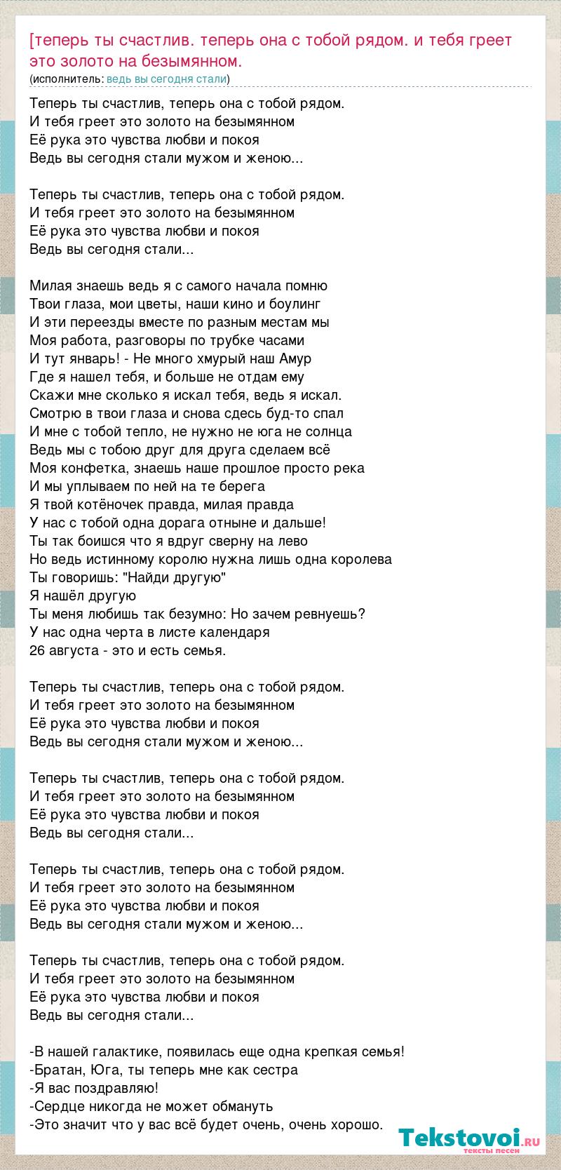 Главная→Исполнители→Ведь вы сегодня стали→[теперь ты счастлив. теперь она с тобой рядом. и тебя греет это золото