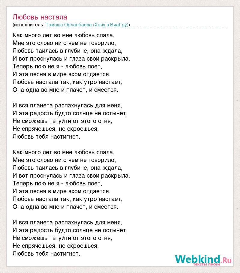 Как много лет во мне любовь спала, Мне это слово ни о чем не говорило, Любовь таилась в глубине, она ждала, И вот проснулась и глаза свои раскрыла. Теперь пою не я - любовь поет, И эта песня в мире эхом отдается. Любовь настала так, как утро настает, Она одна во мне и плачет, и смеется. И вся планета распахнулась для меня, И эта радость будто солнце не остынет, Не сможешь ты уйти от этого огня, Не спрячешься, не скроешься, Любовь тебя настигнет. Как много лет во мне любовь спала, Мне это слово ни о чем не говорило, Любовь таилась в глубине, она ждала, И вот проснулась и глаза свои раскрыла. Теперь пою не я - любовь поет, И эта песня в мире эхом отдается. Любовь настала так, как утро настает, Она одна во мне и плачет, и смеется. И вся планета распахнулась для меня, И эта радость будто солнце не остынет, Не сможешь ты уйти от этого огня, Не спрячешься, не скроешься, Любовь тебя настигнет.