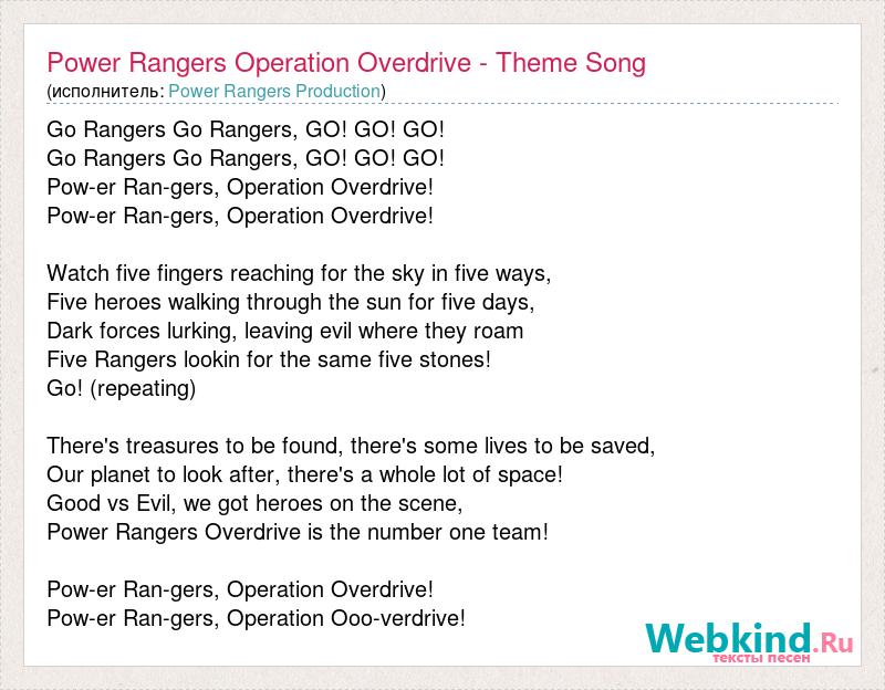 Go Rangers Go Rangers, GO! GO! GO! Go Rangers Go Rangers, GO! GO! GO! Pow-er Ran-gers, Operation Overdrive! Pow-er Ran-gers, Operation Overdrive! Watch five fingers reaching for the sky in five ways, Five heroes walking through the sun for five days, Dark forces lurking, leaving evil where they roam Five Rangers lookin for the same five stones! Go! (repeating) There's treasures to be found, there's some lives to be saved, Our planet to look after, there's a whole lot of space! Good vs Evil, we got heroes on the scene, Power Rangers Overdrive is the number one team! Pow-er Ran-gers, Operation Overdrive! Pow-er Ran-gers, Operation Ooo-verdrive!