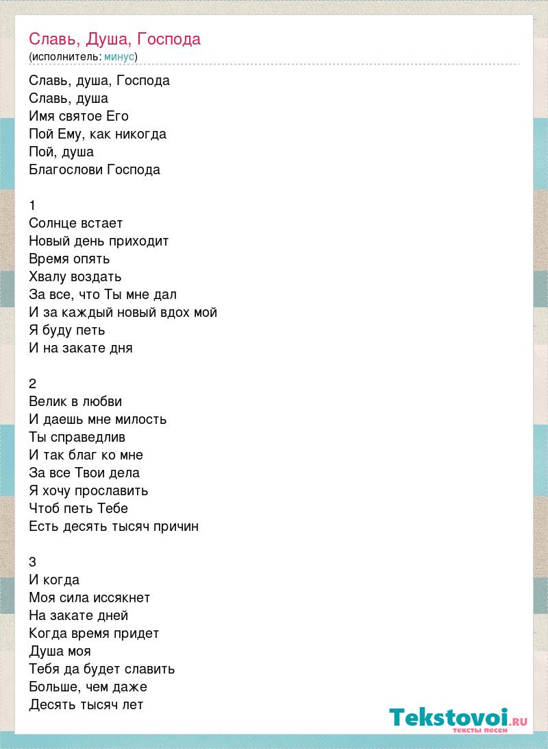 Славь, душа, Господа Славь, душа Имя святое Его Пой Ему, как никогда Пой, душа Благослови Господа 1 Солнце встает Новый день приходит Время опять Хвалу воздать За все, что Ты мне дал И за каждый новый вдох мой Я буду петь И на закате дня 2 Велик в любви И даешь мне милость Ты справедлив И так благ ко мне За все Твои дела Я хочу прославить Чтоб петь Тебе Есть десять тысяч причин 3 И когда Моя сила иссякнет На закате дней Когда время придет Душа моя Тебя да будет славить Больше, чем даже Десять тысяч лет