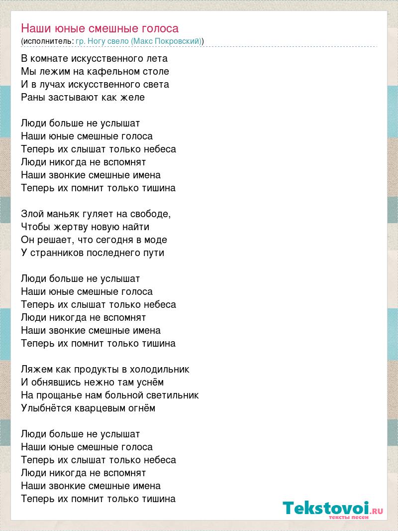 В комнате искусственного лета Мы лежим на кафельном столе И в лучах искусственного света Раны застывают как желе Люди больше не услышат Наши юные смешные голоса Теперь их слышат только небеса Люди никогда не вспомнят Наши звонкие смешные имена Теперь их помнит только тишина Злой маньяк гуляет на свободе, Чтобы жертву новую найти Он решает, что сегодня в моде У странников последнего пути Люди больше не услышат Наши юные смешные голоса Теперь их слышат только небеса Люди никогда не вспомнят Наши звонкие смешные имена Теперь их помнит только тишина Ляжем как продукты в холодильник И обнявшись нежно там уснём На прощанье нам больной светильник Улыбнётся кварцевым огнём Люди больше не услышат Наши юные смешные голоса Теперь их слышат только небеса Люди никогда не вспомнят Наши звонкие смешные имена Теперь их помнит только тишина