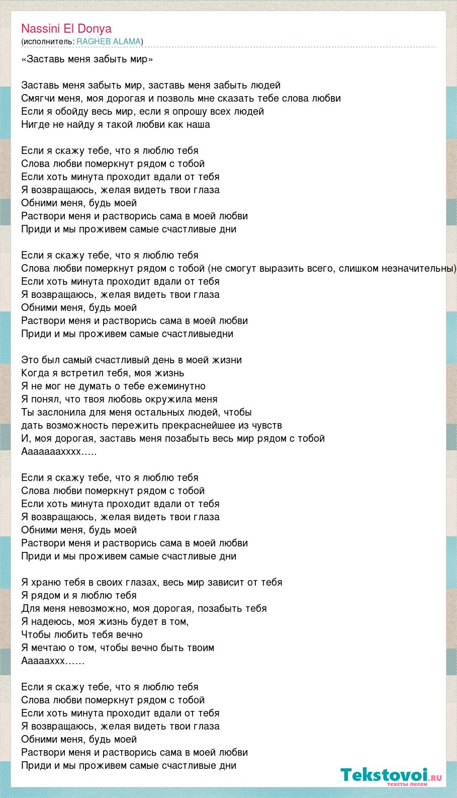 «Заставь меня забыть мир» Заставь меня забыть мир, заставь меня забыть людей Смягчи меня, моя дорогая и позволь мне сказать тебе слова любви Если я обойду весь мир, если я опрошу всех людей Нигде не найду я такой любви как наша Если я скажу тебе, что я люблю тебя Слова любви померкнут рядом с тобой Если хоть минута проходит вдали от тебя Я возвращаюсь, желая видеть твои глаза Обними меня, будь моей Раствори меня и растворись сама в моей любви Приди и мы проживем самые счастливые дни Если я скажу тебе, что я люблю тебя Слова любви померкнут рядом с тобой (не смогут выразить всего, слишком незначительны) Если хоть минута проходит вдали от тебя Я возвращаюсь, желая видеть твои глаза Обними меня, будь моей Раствори меня и растворись сама в моей любви Приди и мы проживем самые счастливыедни Это был самый счастливый день в моей жизни Когда я встретил тебя, моя жизнь Я не мог не думать о тебе ежеминутно Я понял, что твоя любовь окружила меня Ты заслонила для меня остальных людей, чтобы дать возможность пережить прекраснейшее из чувств И, моя дорогая, заставь меня позабыть весь мир рядом с тобой Ааааааахххх….. Если я скажу тебе, что я люблю тебя Слова любви померкнут рядом с тобой Если хоть минута проходит вдали от тебя Я возвращаюсь, желая видеть твои глаза Обними меня, будь моей Раствори меня и растворись сама в моей любви Приди и мы проживем самые счастливые дни Я храню тебя в своих глазах, весь мир зависит от тебя Я рядом и я люблю тебя Для меня невозможно, моя дорогая, позабыть тебя Я надеюсь, моя жизнь будет в том, Чтобы любить тебя вечно Я мечтаю о том, чтобы вечно быть твоим Аааааххх…… Если я скажу тебе, что я люблю тебя Слова любви померкнут рядом с тобой Если хоть минута проходит вдали от тебя Я возвращаюсь, желая видеть твои глаза Обними меня, будь моей Раствори меня и растворись сама в моей любви Приди и мы проживем самые счастливые дни