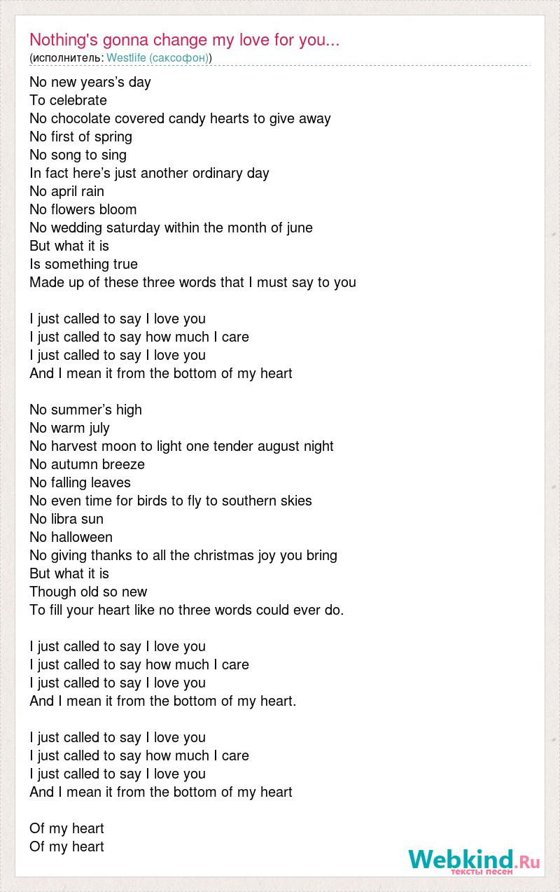 No new years’s day To celebrate No chocolate covered candy hearts to give away No first of spring No song to sing In fact here’s just another ordinary day No april rain No flowers bloom No wedding saturday within the month of june But what it is Is something true Made up of these three words that I must say to you I just called to say I love you I just called to say how much I care I just called to say I love you And I mean it from the bottom of my heart No summer’s high No warm july No harvest moon to light one tender august night No autumn breeze No falling leaves No even time for birds to fly to southern skies No libra sun No halloween No giving thanks to all the christmas joy you bring But what it is Though old so new To fill your heart like no three words could ever do. I just called to say I love you I just called to say how much I care I just called to say I love you And I mean it from the bottom of my heart. I just called to say I love you I just called to say how much I care I just called to say I love you And I mean it from the bottom of my heart Of my heart Of my heart