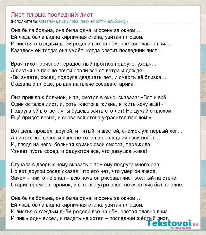 А как ты думаешь, о чем песня "Лист плюща последний лист" ?