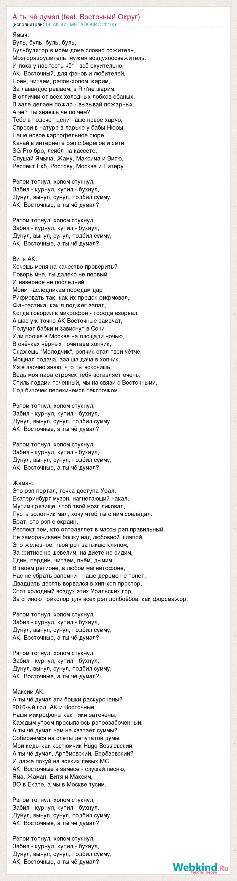 Ямыч: Буль, буль, буль, буль, Бульбулятор в моём доме словно сожитель, Мозгоразрушитель, нужен воздухоосвежитель. И пока у нас "есть чё" - всё охуительно, АК, Восточный, для фэнов и любителей, Поём, читаем, рэпом-хопом жарим, За лавандос решаем, в R'n'не шарим, В отличии от всех холодных лобков ебаных, В зале делаем пожар - вызывай пожарных. А чё? Ты знаешь чё по чём? Тебе в подсчет цени наше новое харчо, Спроси в натуре в ларьке у бабы Нюры, Наше новое картофельное пюре, Качай в интернете рэп с берегов и сети, SG Pro бро, лейбл на кассете, Слушай Ямыча, Жаму, Максима и Витю, Респект Екб, Ростову, Москве и Питеру. Рэпом топнул, хопом стукнул, Забил - курнул, купил - бухнул, Дунул, вынул, сунул, подбил сумму, АК, Восточные, а ты чё думал? Рэпом топнул, хопом стукнул, Забил - курнул, купил - бухнул, Дунул, вынул, сунул, подбил сумму, АК, Восточные, а ты чё думал? Витя АК: Хочешь меня на качество проверить? Поверь мне, ты далеко не первый И наверное не последний, Моим наследникам передам дар Рифмовать так, как их предок рифмовал, Фантастика, как я поджёг запал, Когда говорил в микрофон - города взорвал. А щас уж точно АК Восточные замочат, Получат бабки и зависнут в Сочи Или проще в Москве на площади ночью, В очёчках чёрных почитаем хопчик, Скажешь "Молодчик", рэпчик стал твой чётче, Мощная подача, ааа ща дача в хопчик. Уже заочно знаю, что ты вскочишь, Ведь моя пара строчек тебя вставляет очень, Стиль годами точенный, мы на связи с Восточными, Под биточек перекинемся тексточком. Рэпом топнул, хопом стукнул, Забил - курнул, купил - бухнул, Дунул, вынул, сунул, подбил сумму, АК, Восточные, а ты чё думал? Рэпом топнул, хопом стукнул, Забил - курнул, купил - бухнул, Дунул, вынул, сунул, подбил сумму, АК, Восточные, а ты чё думал? Жаман: Это рэп портал, точка доступа Урал, Екатеринбург музон, нагнетающий накал, Мутим грязище, чтоб твой мозг ликовал, Пусть золотник мал, хочу чтоб ты с ним совладал. Брат, это рэп с окраин, Респект тем, кто отправляет в массы рэп правильный, Не заморачиваем бошку над любовной шляпой, Это железное, твой рот затыкаю кляпом, За фитнес не шевелим, на диете не сидим, Едим, пердим, читаем, пьём, дымим. В твоём регионе, в любом магнитофоне, Нас не убрать запомни - наше дерьмо не тонет, Двадцать десять ворвался в хип-хоп простор, Этот холодный воздух этих Уральских гор, За спиною триколор для всех рэп долбоёбов, как форсмажор. Рэпом топнул, хопом стукнул, Забил - курнул, купил - бухнул, Дунул, вынул, сунул, подбил сумму, АК, Восточные, а ты чё думал? Рэпом топнул, хопом стукнул, Забил - курнул, купил - бухнул, Дунул, вынул, сунул, подбил сумму, АК, Восточные, а ты чё думал? Максим АК: А ты чё думал эти бошки раскурочены? 2010-ый год, АК и Восточные, Наши микрофоны как пики заточены, Каждым утром просыпаюсь рэпоозабоченный, А ты чё думал нам не хватает суммы? Собираемся на слёты депутатов думы, Мои кеды как костюмчик Hugo Boss'овский, А ты чё думал, Артёмовский, Берёзовский? И даже похуй на всяких левых MC, АК, Восточные в замесе - слушай песню, Яма, Жаман, Витя и Максим, ВО в Екате, а мы в Москве тусим. Рэпом топнул, хопом стукнул, Забил - курнул, купил - бухнул, Дунул, вынул, сунул, подбил сумму, АК, Восточные, а ты чё думал? Рэпом топнул, хопом стукнул, Забил - курнул, купил - бухнул, Дунул, вынул, сунул, подбил сумму, АК, Восточные, а ты чё думал?