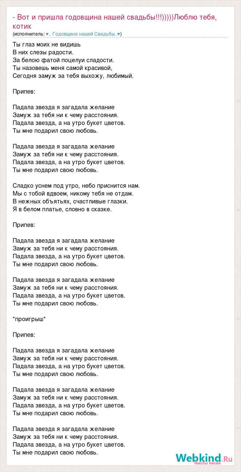 Ты глаз моих не видишь В них слезы радости. За белою фатой поцелуи сладости. Ты назовешь меня самой красивой, Сегодня замуж за тебя выхожу, любимый. Припев: Падала звезда я загадала желание Замуж за тебя ни к чему расстояния. Падала звезда, а на утро букет цветов. Ты мне подарил свою любовь. Падала звезда я загадала желание Замуж за тебя ни к чему расстояния. Падала звезда, а на утро букет цветов. Ты мне подарил свою любовь. Сладко уснем под утро, небо приснится нам. Мы с тобой вдвоем, никому тебя не отдам. В нежных объятьях, счастливые глазки. Я в белом платье, словно в сказке. Припев: Падала звезда я загадала желание Замуж за тебя ни к чему расстояния. Падала звезда, а на утро букет цветов. Ты мне подарил свою любовь. Падала звезда я загадала желание Замуж за тебя ни к чему расстояния. Падала звезда, а на утро букет цветов. Ты мне подарил свою любовь. *проигрыш* Припев: Падала звезда я загадала желание Замуж за тебя ни к чему расстояния. Падала звезда, а на утро букет цветов. Ты мне подарил свою любовь. Падала звезда я загадала желание Замуж за тебя ни к чему расстояния. Падала звезда, а на утро букет цветов. Ты мне подарил свою любовь. Падала звезда я загадала желание Замуж за тебя ни к чему расстояния. Падала звезда, а на утро букет цветов. Ты мне подарил свою любовь.
