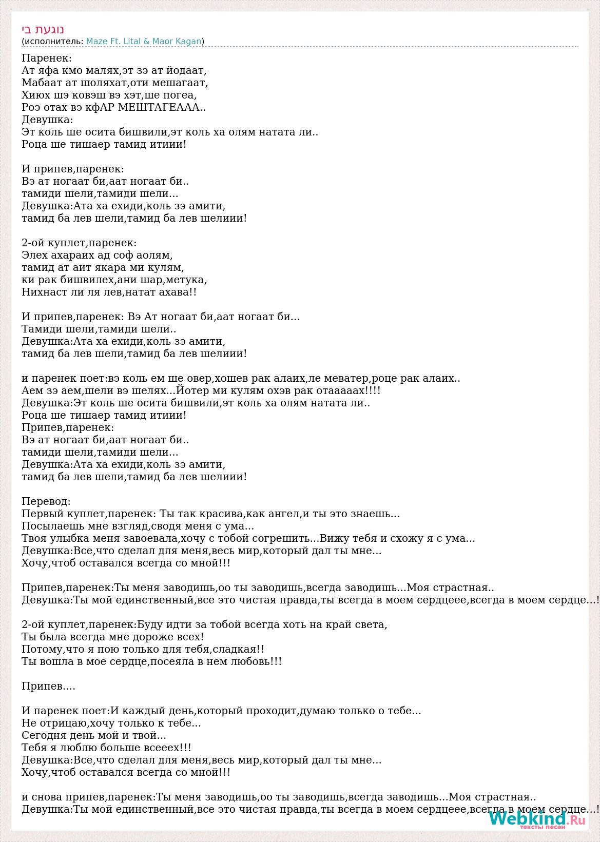 Паренек: Ат яфа кмо малях,эт зэ ат йодаат, Мабаат ат шоляхат,оти мешагаат, Хиюх шэ ковэш вэ хэт,ше погеа, Роэ отах вэ кфАР МЕШТАГЕААА.. Девушка: Эт коль ше осита бишвили,эт коль ха олям натата ли.. Роца ше тишаер тамид итиии! И припев,паренек: Вэ ат ногаат би,аат ногаат би.. тамиди шели,тамиди шели... Девушка:Ата ха ехиди,коль зэ амити, тамид ба лев шели,тамид ба лев шелиии! 2-ой куплет,паренек: Элех ахараих ад соф аолям, тамид ат аит якара ми кулям, ки рак бишвилех,ани шар,метука, Нихнаст ли ля лев,натат ахава!! И припев,паренек: Вэ Ат ногаат би,аат ногаат би... Тамиди шели,тамиди шели.. Девушка:Ата ха ехиди,коль зэ амити, тамид ба лев шели,тамид ба лев шелиии! и паренек поет:вэ коль ем ше овер,хошев рак алаих,ле меватер,роце рак алаих.. Аем зэ аем,шели вэ шелях...Йотер ми кулям охэв рак отааааах!!!! Девушка:Эт коль ше осита бишвили,эт коль ха олям натата ли.. Роца ше тишаер тамид итиии! Припев,паренек: Вэ ат ногаат би,аат ногаат би.. тамиди шели,тамиди шели... Девушка:Ата ха ехиди,коль зэ амити, тамид ба лев шели,тамид ба лев шелиии! Перевод: Первый куплет,паренек: Ты так красива,как ангел,и ты это знаешь... Посылаешь мне взгляд,сводя меня с ума... Твоя улыбка меня завоевала,хочу с тобой согрешить...Вижу тебя и схожу я с ума... Девушка:Все,что сделал для меня,весь мир,который дал ты мне... Хочу,чтоб оставался всегда со мной!!! Припев,паренек:Ты меня заводишь,оо ты заводишь,всегда заводишь...Моя страстная.. Девушка:Ты мой единственный,все это чистая правда,ты всегда в моем сердцеее,всегда в моем сердце...! 2-ой куплет,паренек:Буду идти за тобой всегда хоть на край света, Ты была всегда мне дороже всех! Потому,что я пою только для тебя,сладкая!! Ты вошла в мое сердце,посеяла в нем любовь!!! Припев.... И паренек поет:И каждый день,который проходит,думаю только о тебе... Не отрицаю,хочу только к тебе... Сегодня день мой и твой... Тебя я люблю больше всееех!!! Девушка:Все,что сделал для меня,весь мир,который дал ты мне... Хочу,чтоб оставался всегда со мной!!! и снова припев,паренек:Ты меня заводишь,оо ты заводишь,всегда заводишь...Моя страстная.. Девушка:Ты мой единственный,все это чистая правда,ты всегда в моем сердцеее,всегда в моем сердце...!