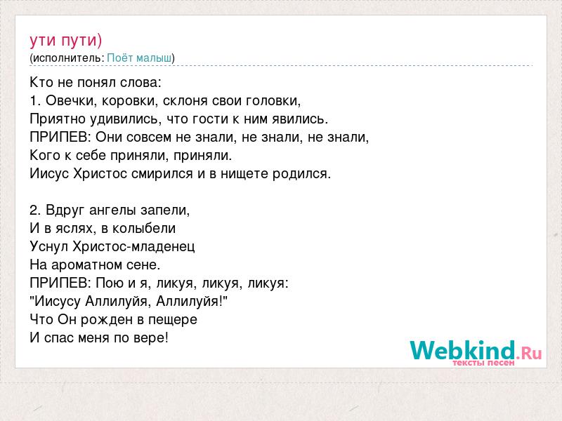 Кто не понял слова: 1. Овечки, коровки, склоня свои головки, Приятно удивились, что гости к ним явились. ПРИПЕВ: Они совсем не знали, не знали, не знали, Кого к себе приняли, приняли. Иисус Христос смирился и в нищете родился. 2. Вдруг ангелы запели, И в яслях, в колыбели Уснул Христос-младенец На ароматном сене. ПРИПЕВ: Пою и я, ликуя, ликуя, ликуя: "Иисусу Аллилуйя, Аллилуйя!" Что Он рожден в пещере И спас меня по вере!