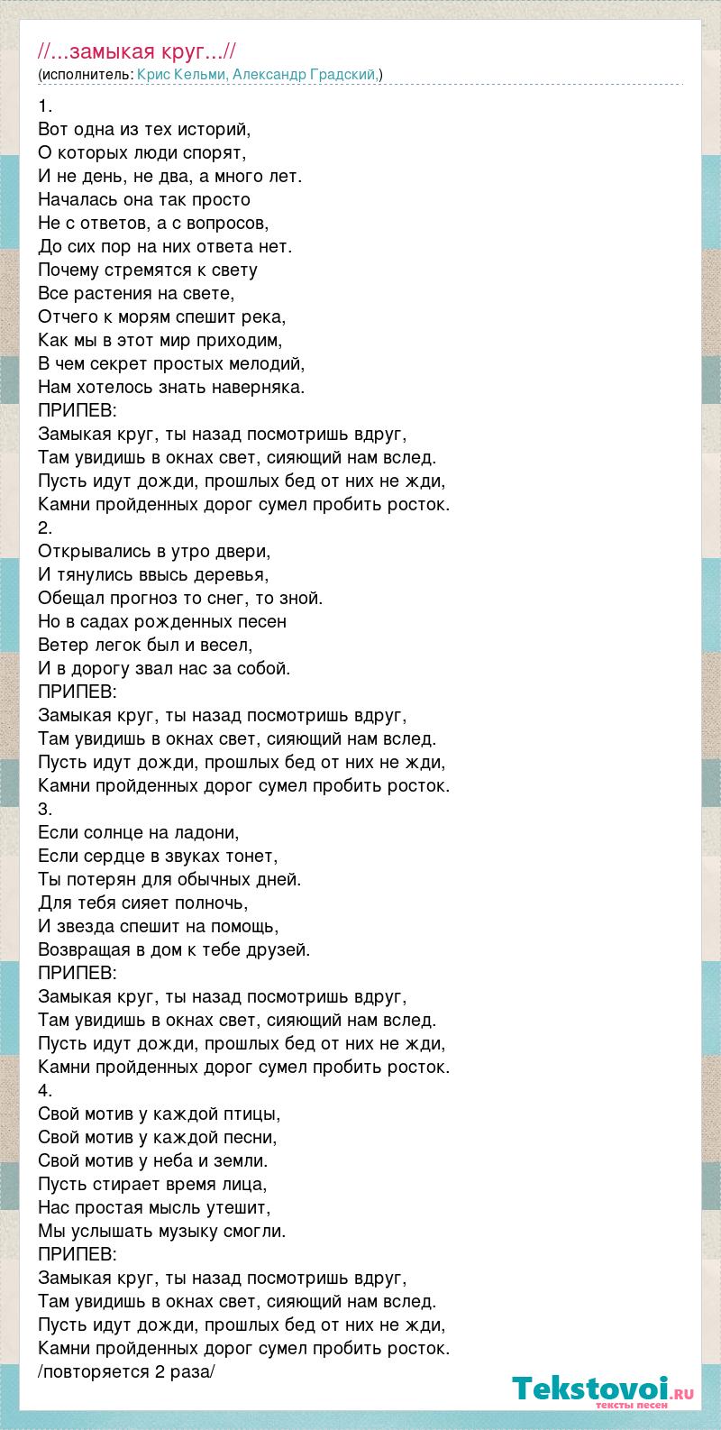 1. Вот одна из тех историй, О которых люди спорят, И не день, не два, а много лет. Началась она так просто Не с ответов, а с вопросов, До сих пор на них ответа нет. Почему стремятся к свету Все растения на свете, Отчего к морям спешит река, Как мы в этот мир приходим, В чем секрет простых мелодий, Нам хотелось знать наверняка. ПРИПЕВ: Замыкая круг, ты назад посмотришь вдруг, Там увидишь в окнах свет, сияющий нам вслед. Пусть идут дожди, прошлых бед от них не жди, Камни пройденных дорог сумел пробить росток. 2. Открывались в утро двери, И тянулись ввысь деревья, Обещал прогноз то снег, то зной. Но в садах рожденных песен Ветер легок был и весел, И в дорогу звал нас за собой. ПРИПЕВ: Замыкая круг, ты назад посмотришь вдруг, Там увидишь в окнах свет, сияющий нам вслед. Пусть идут дожди, прошлых бед от них не жди, Камни пройденных дорог сумел пробить росток. 3. Если солнце на ладони, Если сердце в звуках тонет, Ты потерян для обычных дней. Для тебя сияет полночь, И звезда спешит на помощь, Возвращая в дом к тебе друзей. ПРИПЕВ: Замыкая круг, ты назад посмотришь вдруг, Там увидишь в окнах свет, сияющий нам вслед. Пусть идут дожди, прошлых бед от них не жди, Камни пройденных дорог сумел пробить росток. 4. Свой мотив у каждой птицы, Свой мотив у каждой песни, Свой мотив у неба и земли. Пусть стирает время лица, Нас простая мысль утешит, Мы услышать музыку смогли. ПРИПЕВ: Замыкая круг, ты назад посмотришь вдруг, Там увидишь в окнах свет, сияющий нам вслед. Пусть идут дожди, прошлых бед от них не жди, Камни пройденных дорог сумел пробить росток. /повторяется 2 раза/