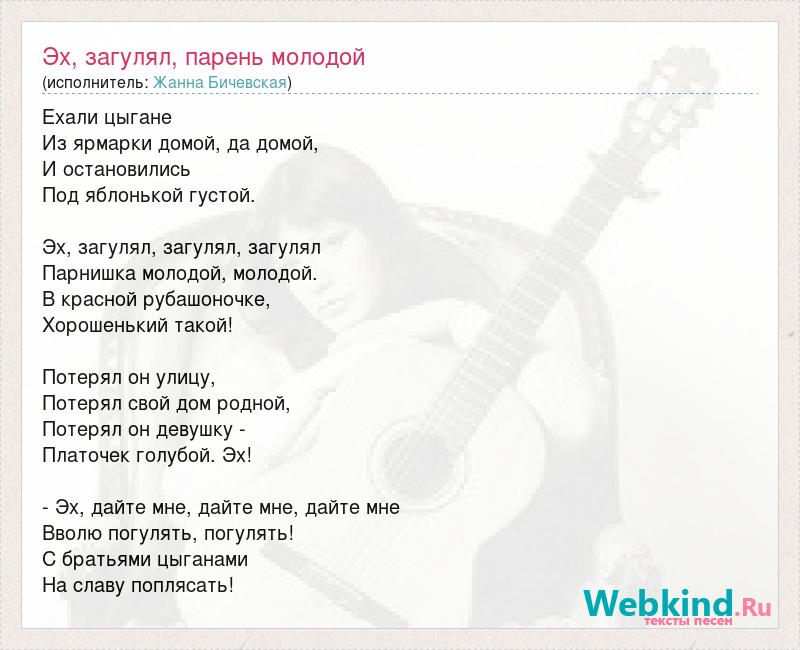 Ехали цыгане Из ярмарки домой, да домой, И остановились Под яблонькой густой. Эх, загулял, загулял, загулял Парнишка молодой, молодой. В красной рубашоночке, Хорошенький такой! Потерял он улицу, Потерял свой дом родной, Потерял он девушку - Платочек голубой. Эх! - Эх, дайте мне, дайте мне, дайте мне Вволю погулять, погулять! С братьями цыганами На славу поплясать!