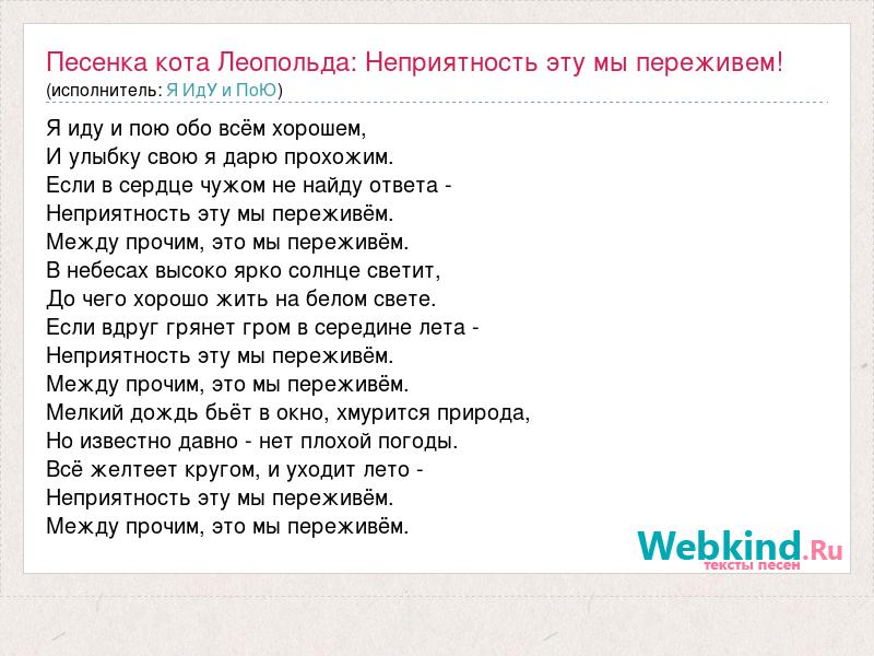 Я иду и пою обо всём хорошем, И улыбку свою я дарю прохожим. Если в сердце чужом не найду ответа - Неприятность эту мы переживём. Между прочим, это мы переживём. В небесах высоко ярко солнце светит, До чего хорошо жить на белом свете. Если вдруг грянет гром в середине лета - Неприятность эту мы переживём. Между прочим, это мы переживём. Мелкий дождь бьёт в окно, хмурится природа, Но известно давно - нет плохой погоды. Всё желтеет кругом, и уходит лето - Неприятность эту мы переживём. Между прочим, это мы переживём.